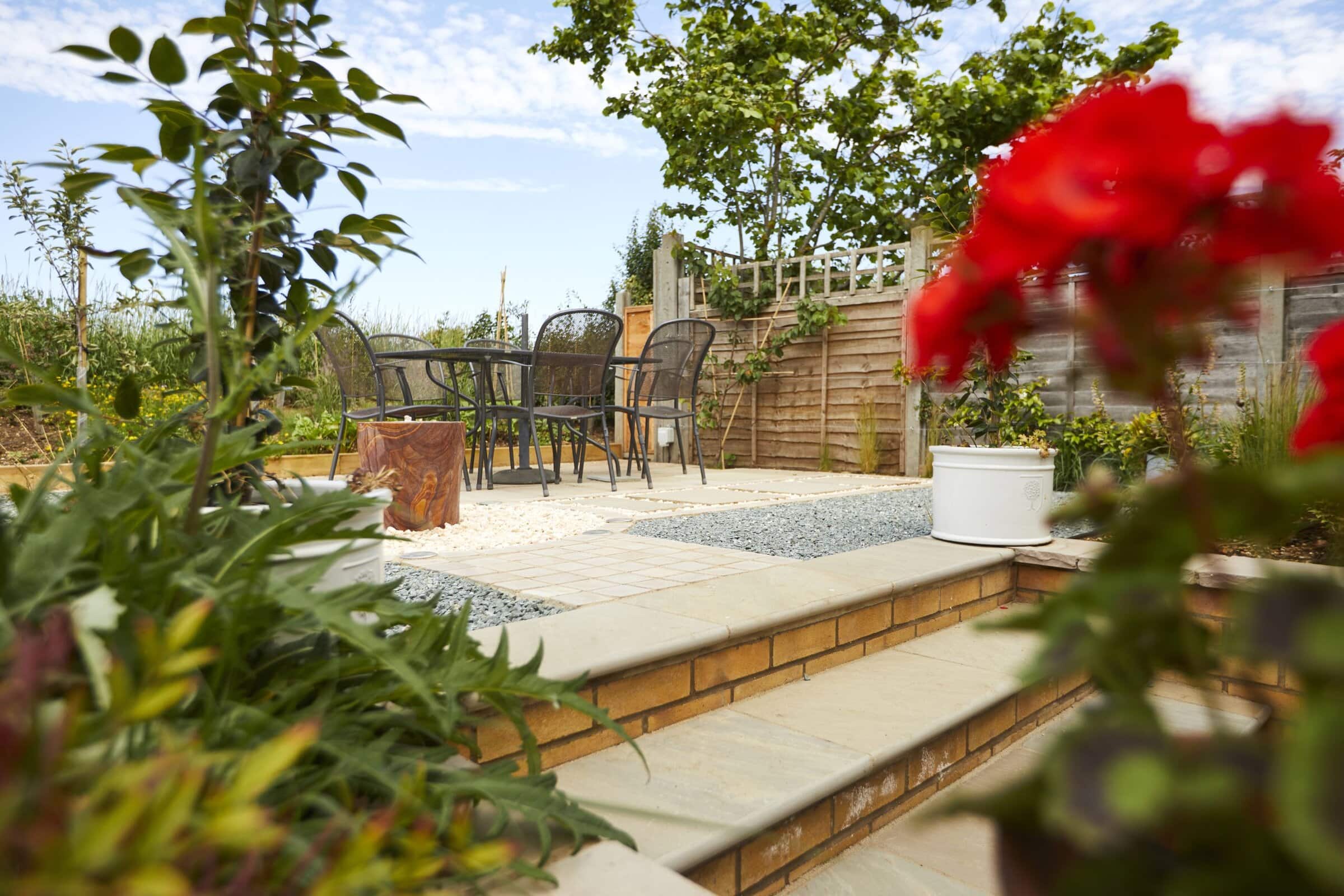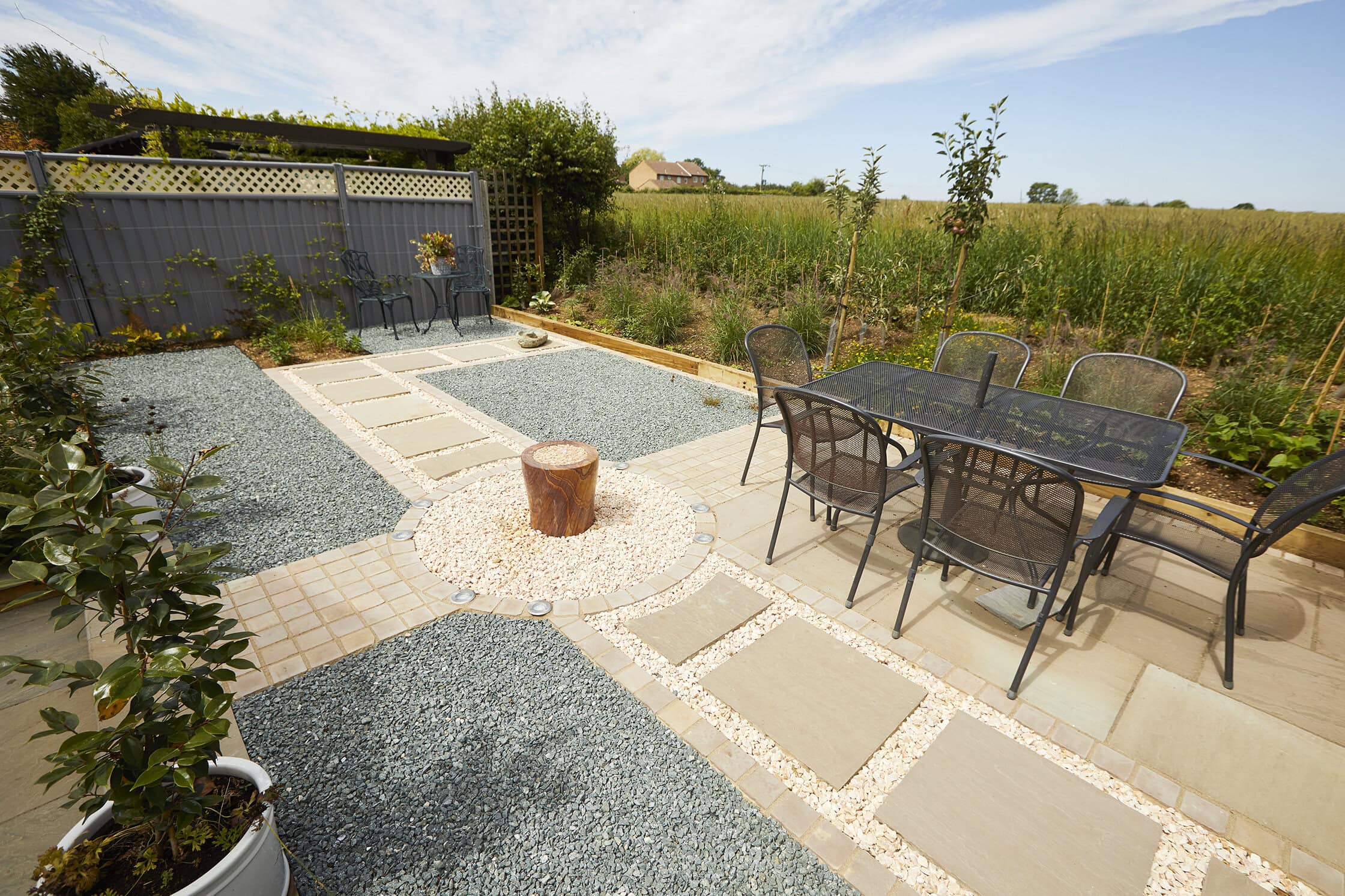 We’ve incorporated two-tone aggregates to bring contrast and depth to the landscape. These carefully selected materials introduce subtle colour variations, accentuating the garden’s features while keeping maintenance to a minimum. The aggregates’ natural tones echo the surrounding field and blend harmoniously with the garden’s plantings, creating a coherent and visually pleasing palette.