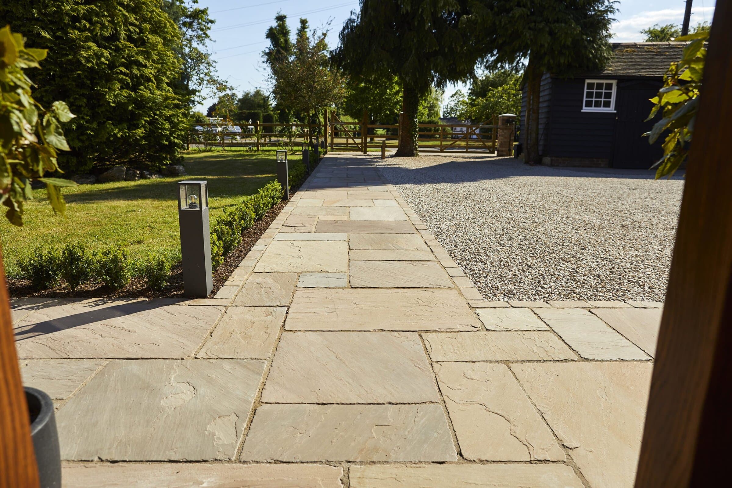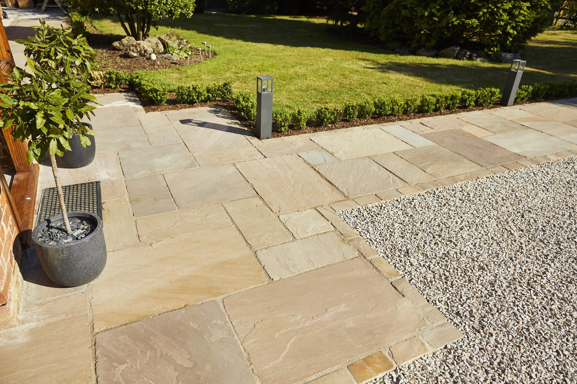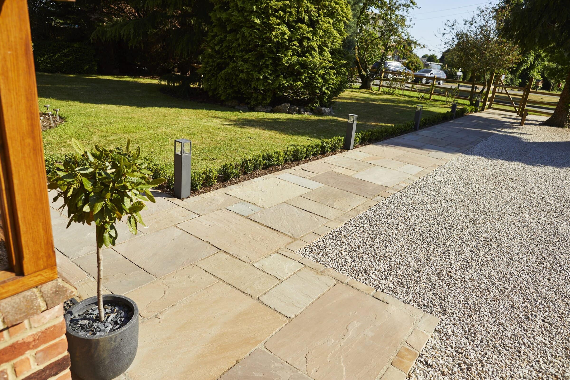 In the Greenfarm Barn project, we undertook the unique challenge of harmoniously uniting a contemporary commercial building with a historic farmhouse. We chose to implement tumbled sandstone paving across the entire area, incorporating a matching sett threshold for a striking visual effect. Our design further encompassed diverse planting beds and a strategic lighting plan, effectively highlighting the traditional pathways and creating a seamless blend of past and present.
