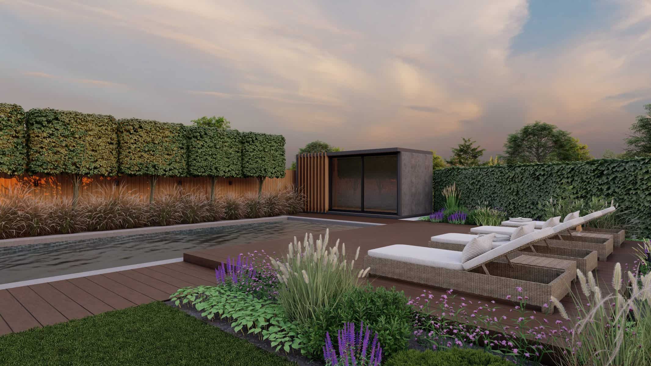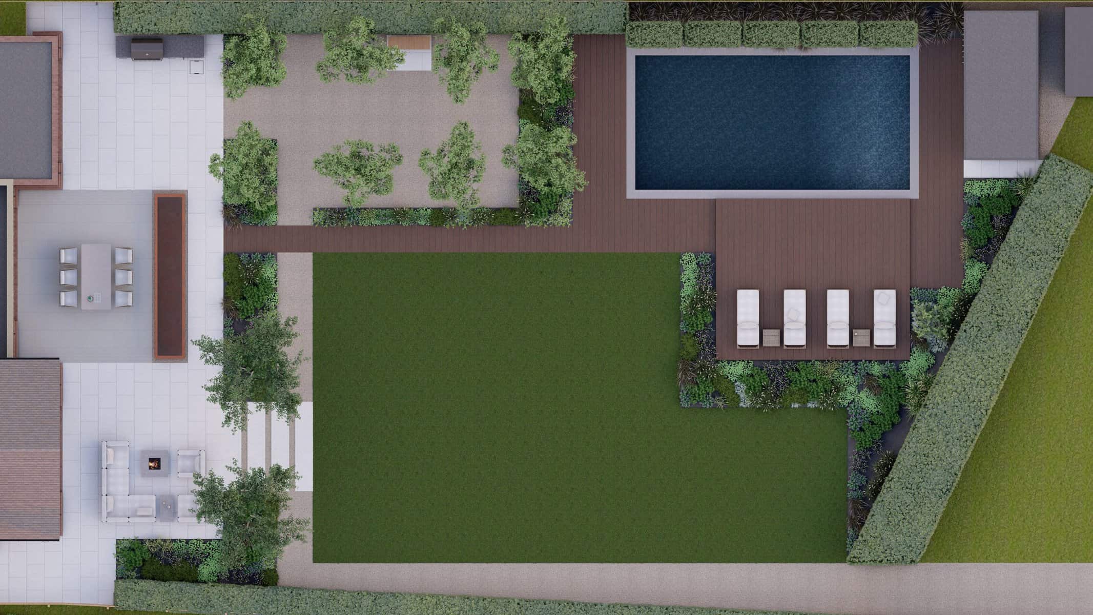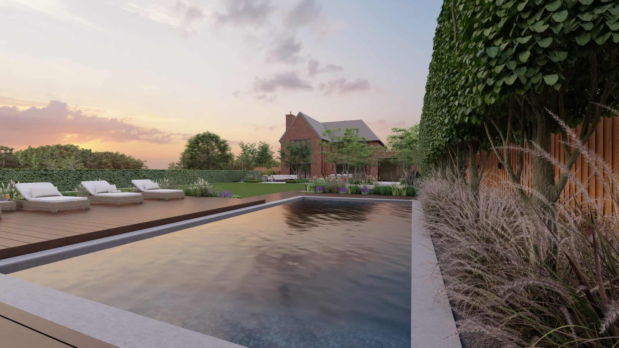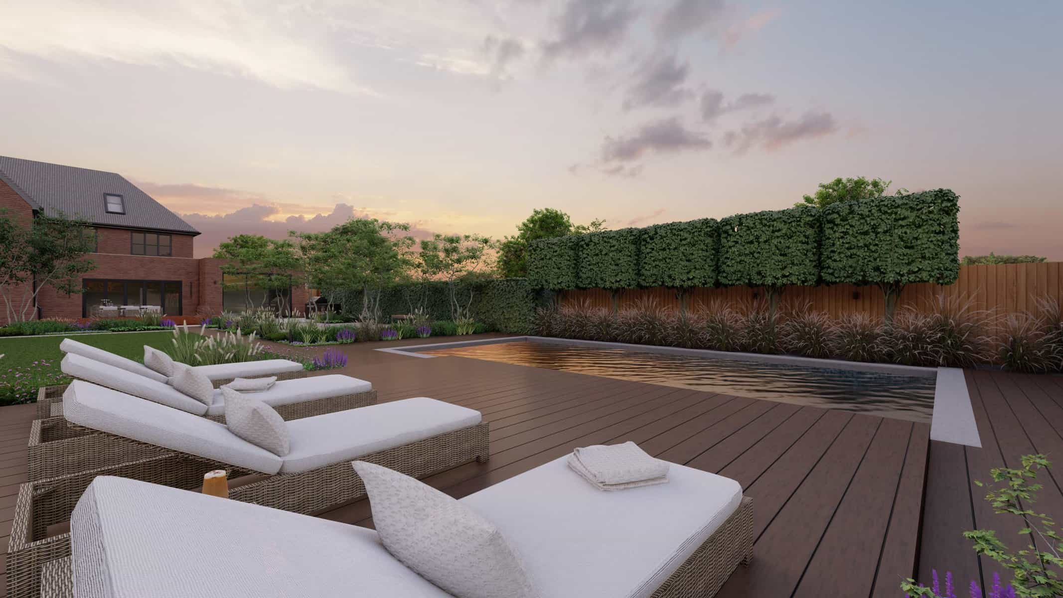 No luxury outdoor design is complete without a swimming pool, and our project is no exception. Our 3D renders vividly capture the allure of the sparkling pool, with sleek sun loungers for those leisurely afternoons. The decking, made from premium materials, adds a touch of warmth and natural elegance to the pool area.