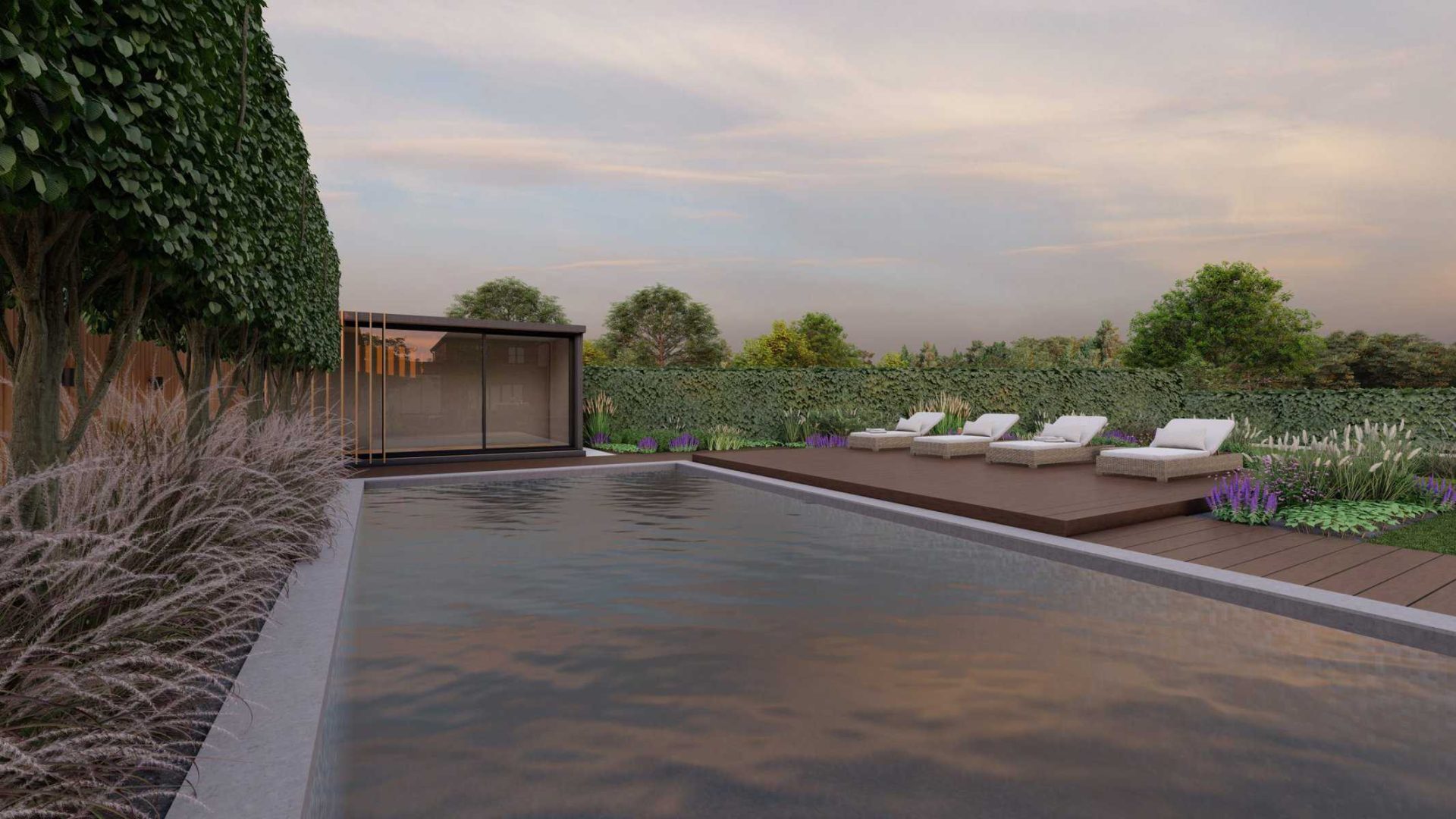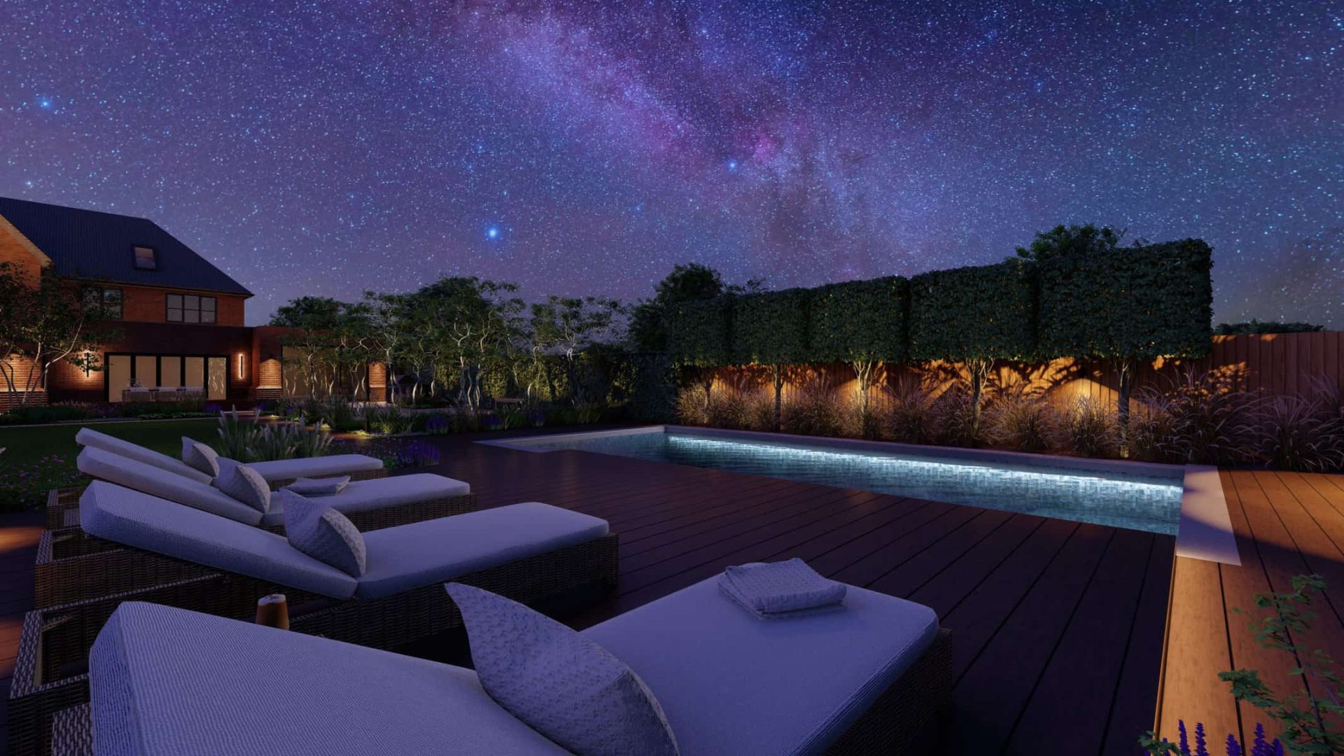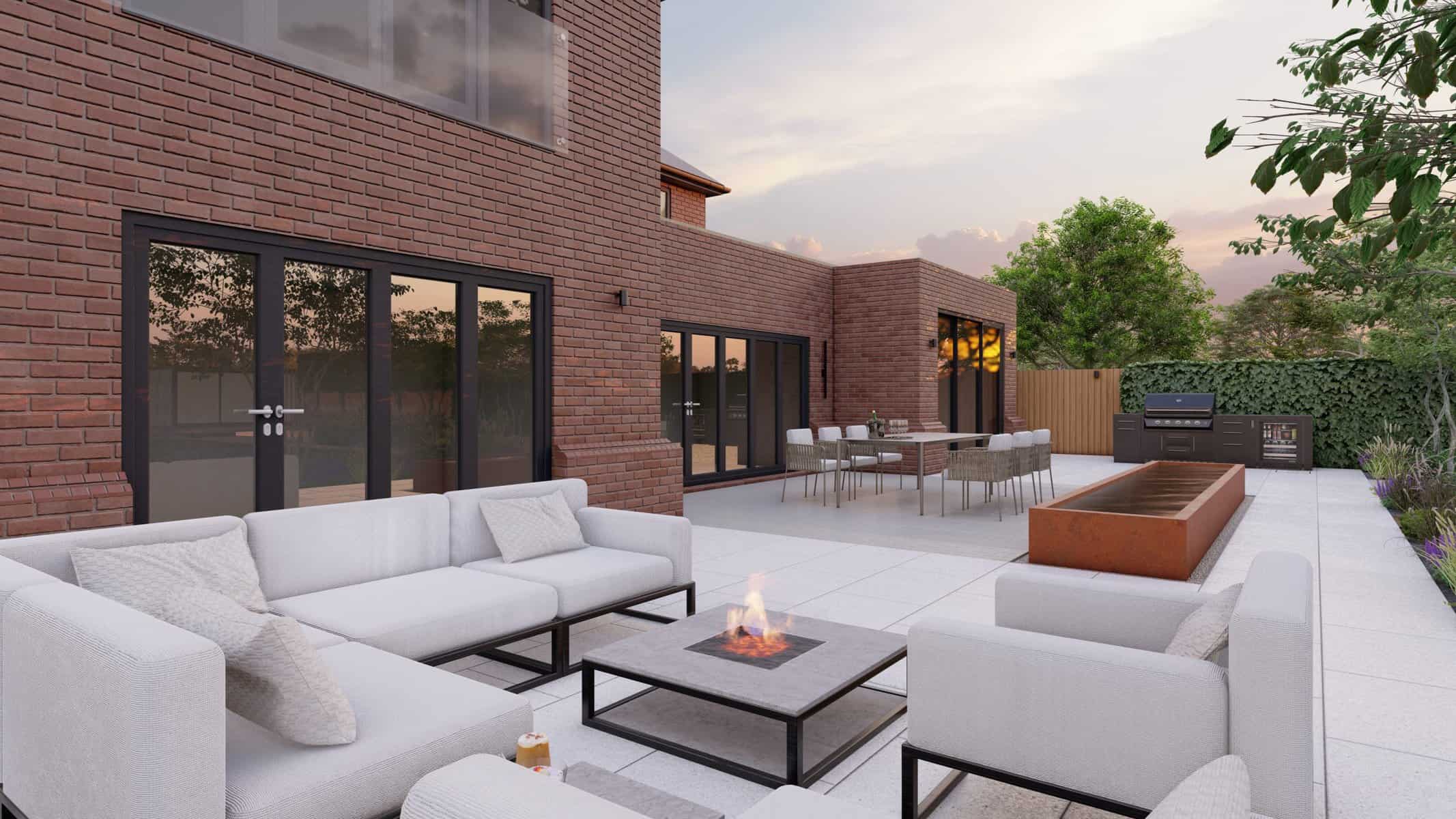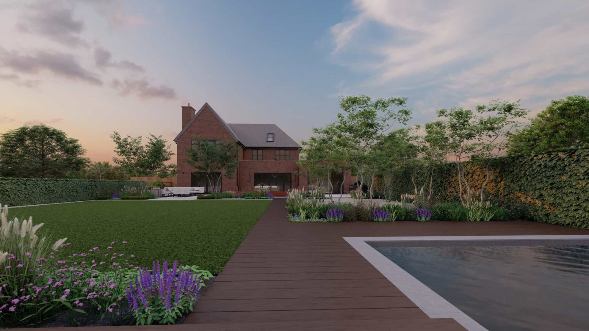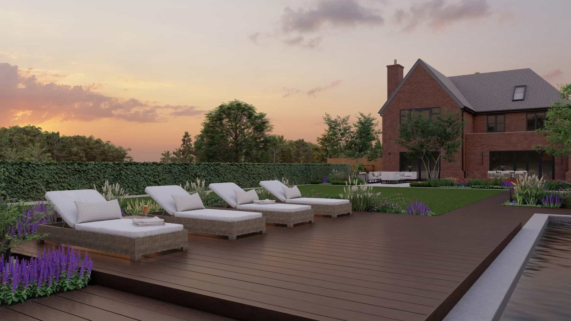 No luxury outdoor design is complete without a swimming pool, and our project is no exception. Our 3D renders vividly capture the allure of the sparkling pool, with sleek sun loungers for those leisurely afternoons. The decking, made from premium materials, adds a touch of warmth and natural elegance to the pool area.