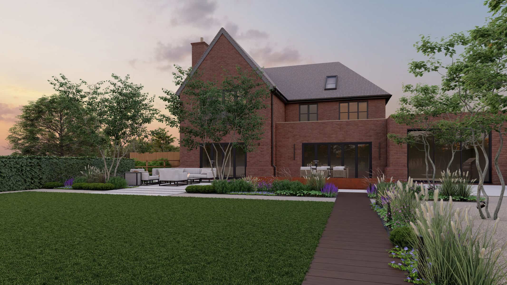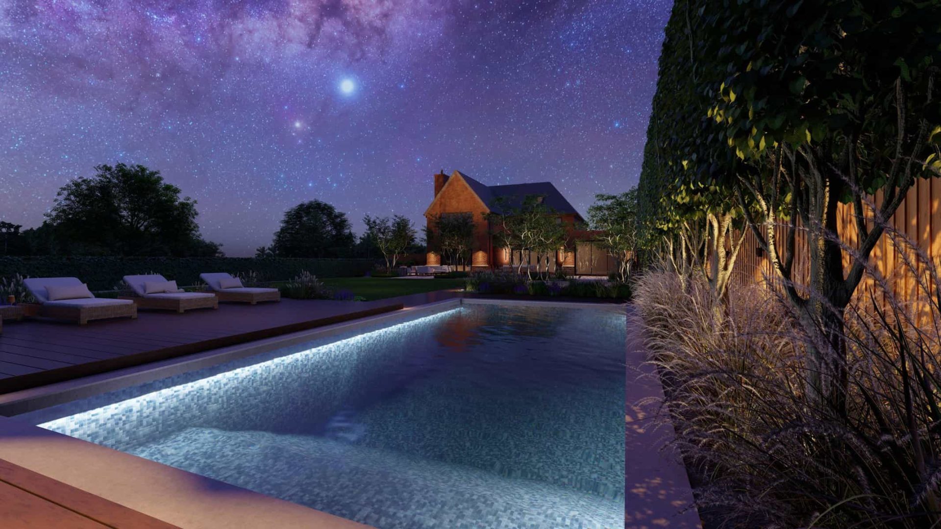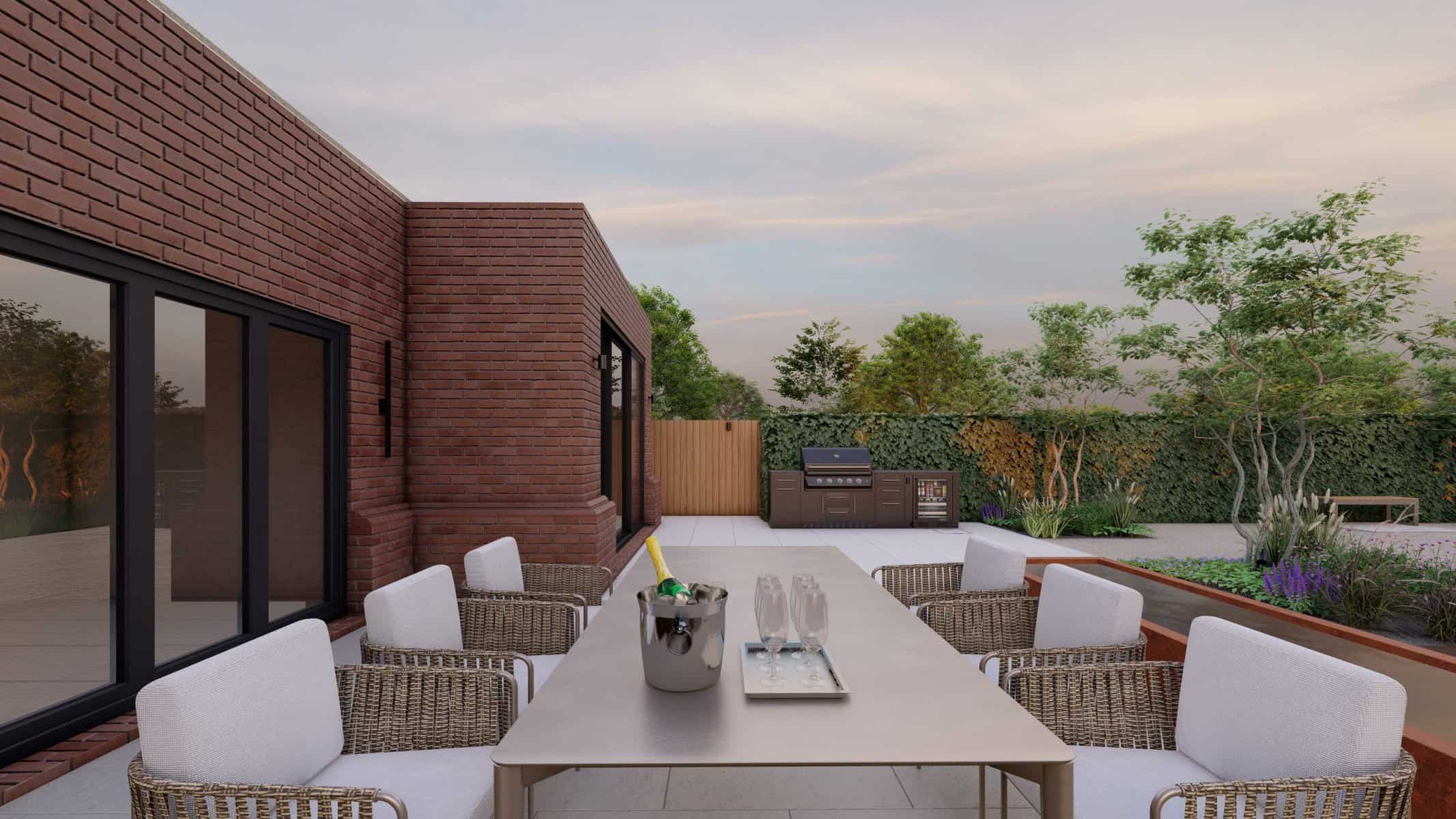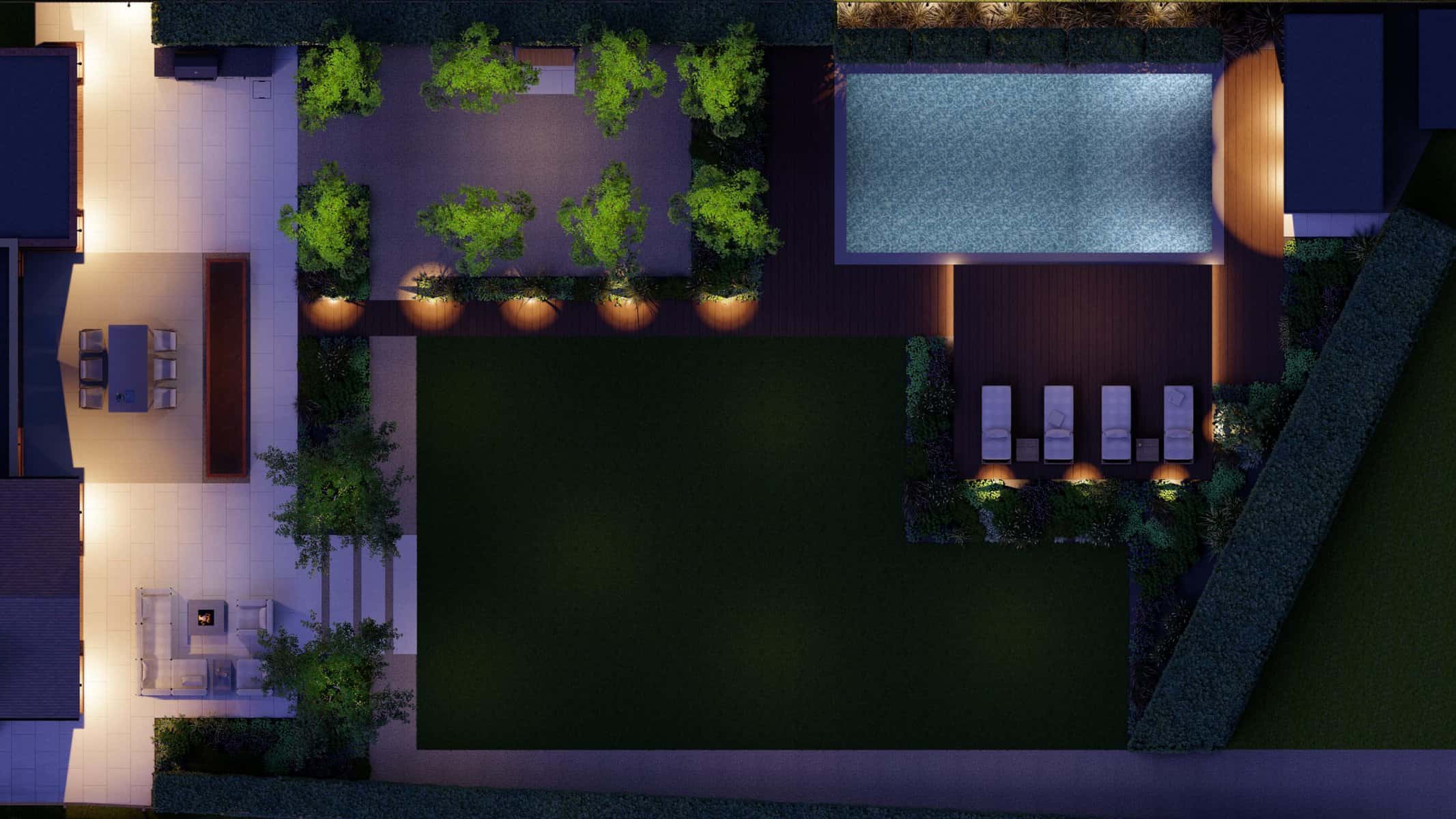 No luxury outdoor design is complete without a swimming pool, and our project is no exception. Our 3D renders vividly capture the allure of the sparkling pool, with sleek sun loungers for those leisurely afternoons. The decking, made from premium materials, adds a touch of warmth and natural elegance to the pool area.