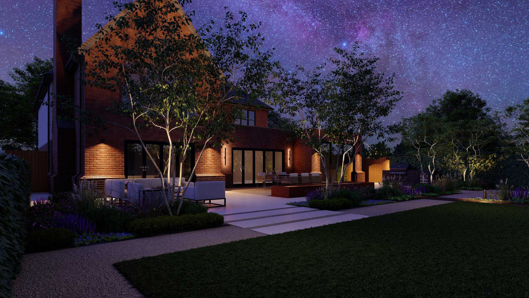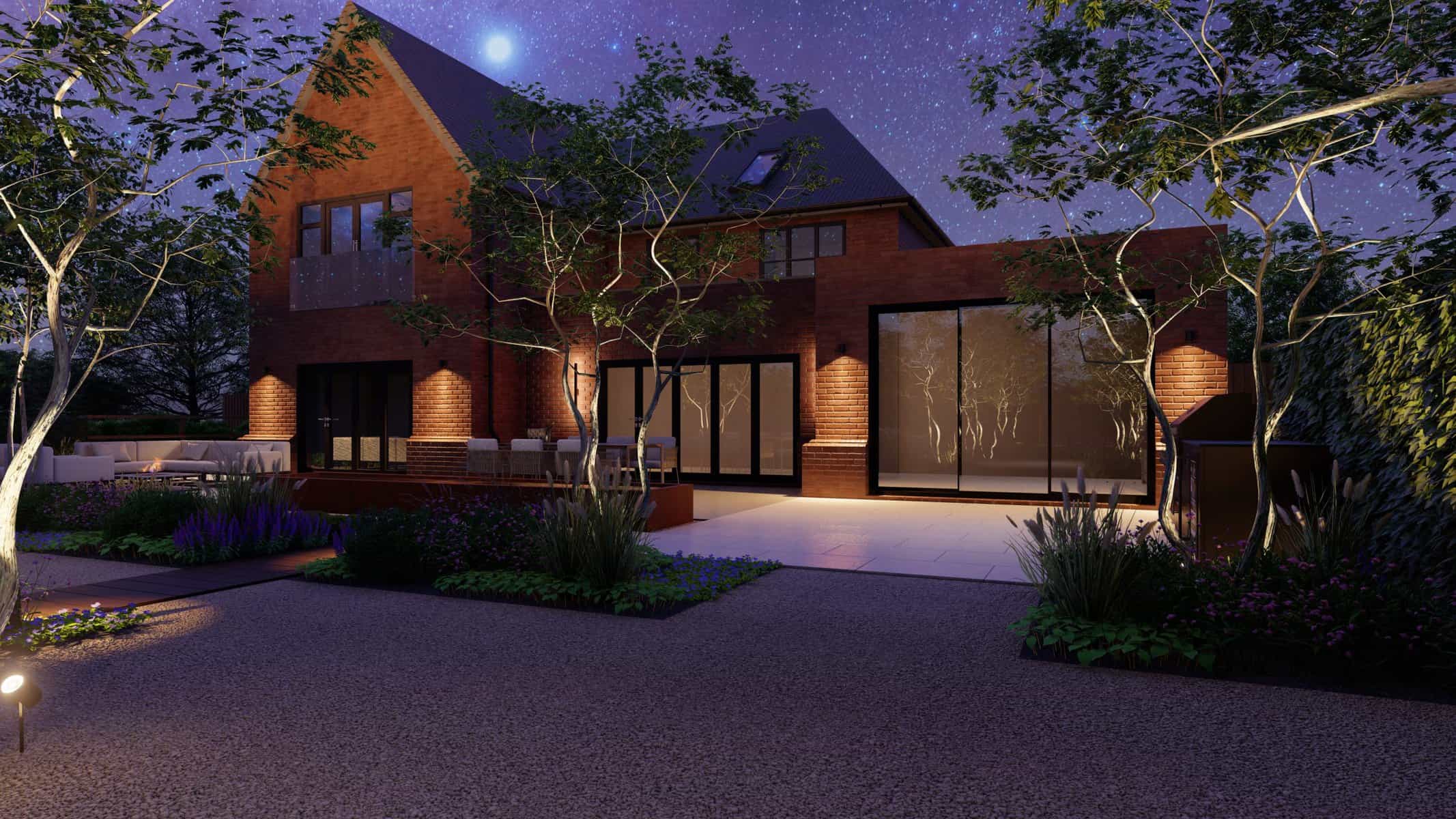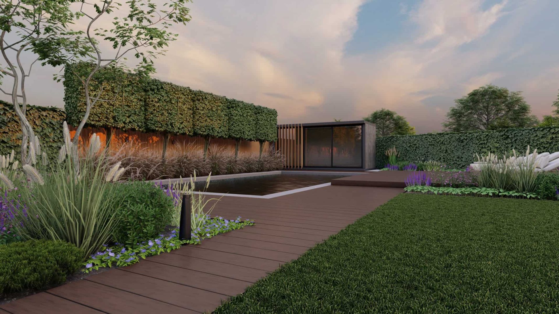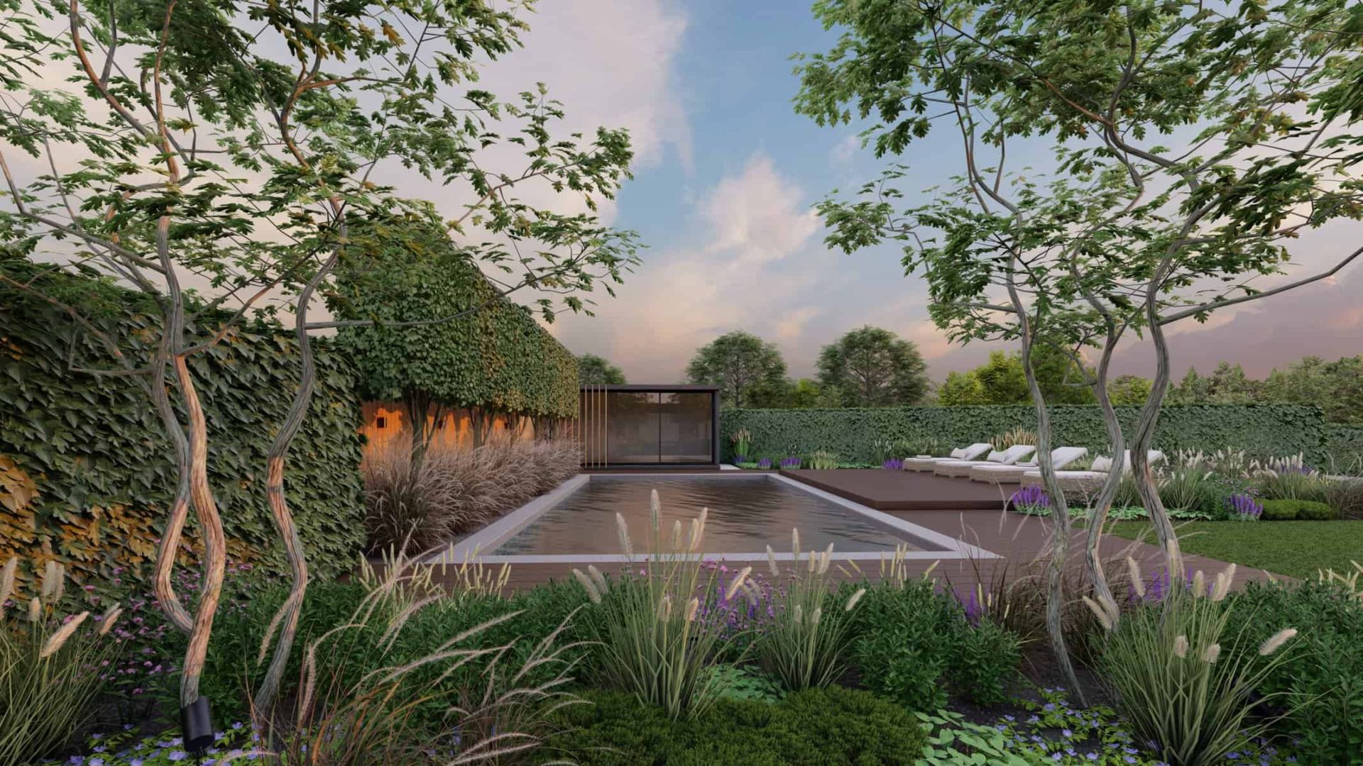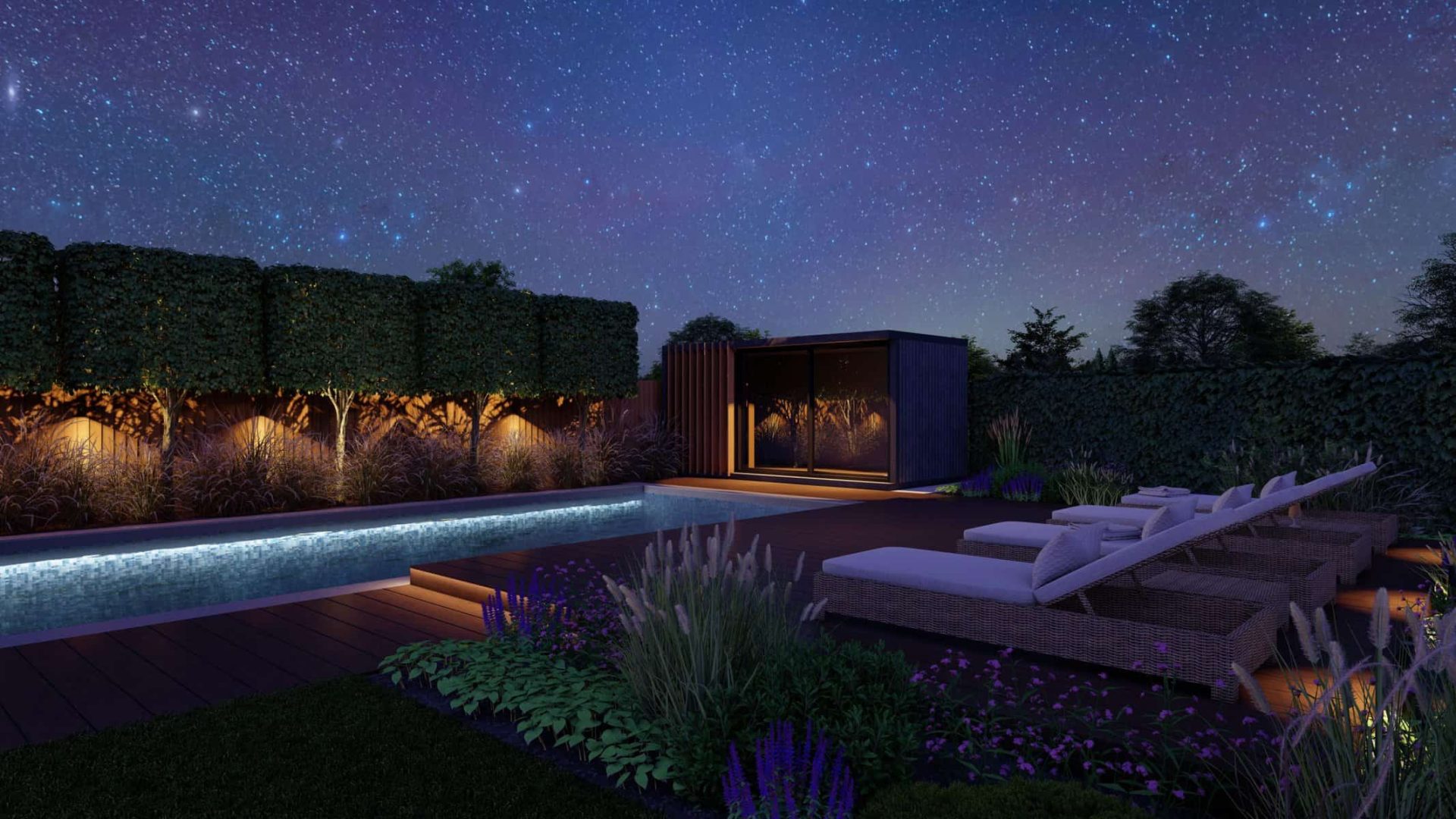 No luxury outdoor design is complete without a swimming pool, and our project is no exception. Our 3D renders vividly capture the allure of the sparkling pool, with sleek sun loungers for those leisurely afternoons. The decking, made from premium materials, adds a touch of warmth and natural elegance to the pool area.