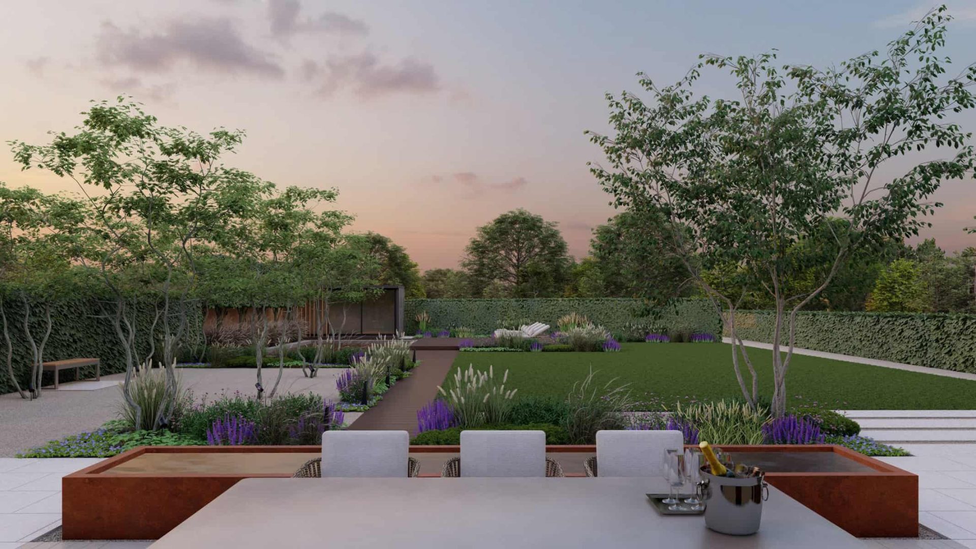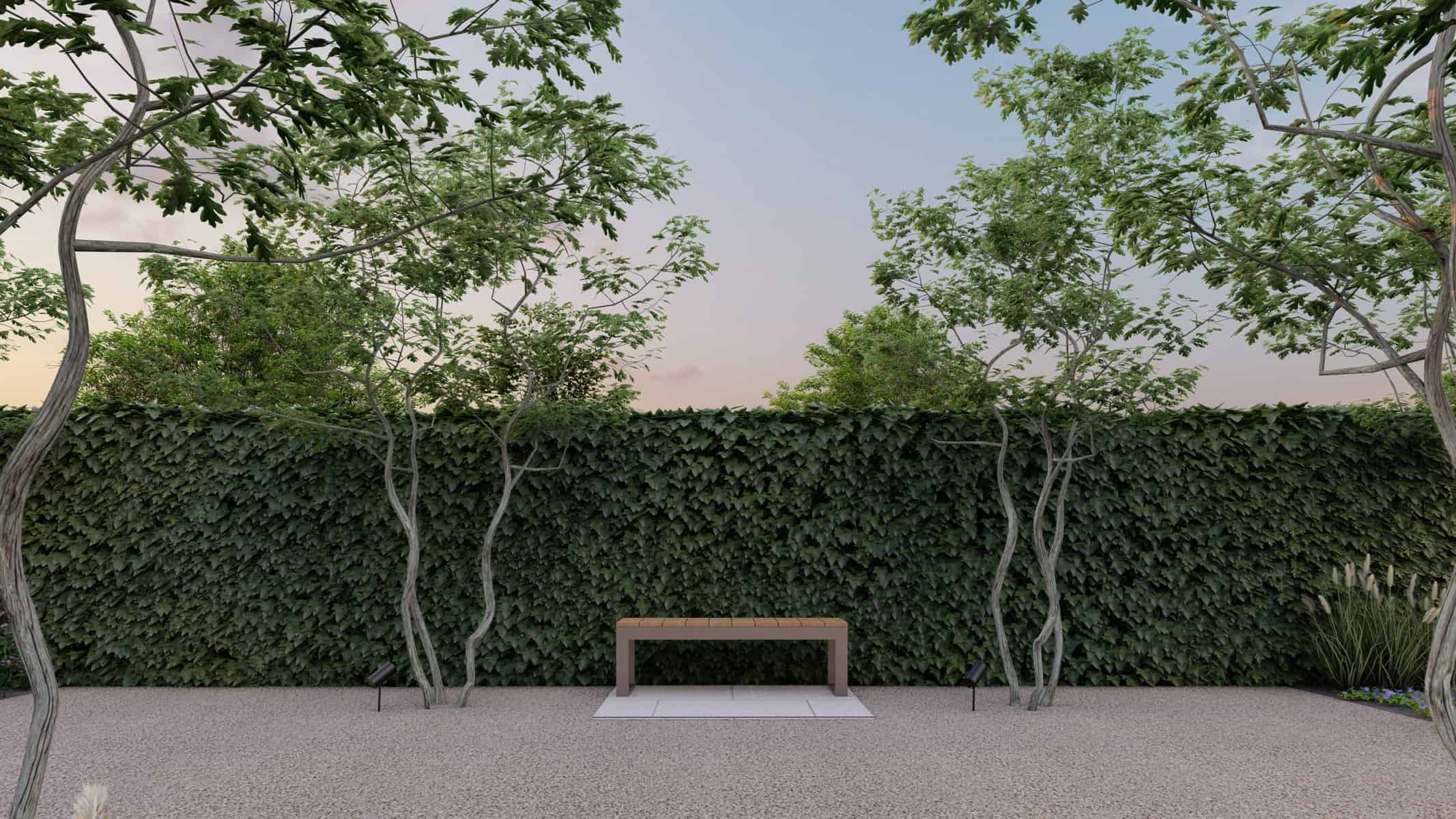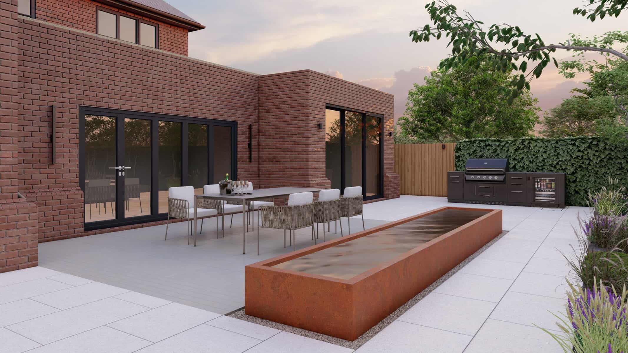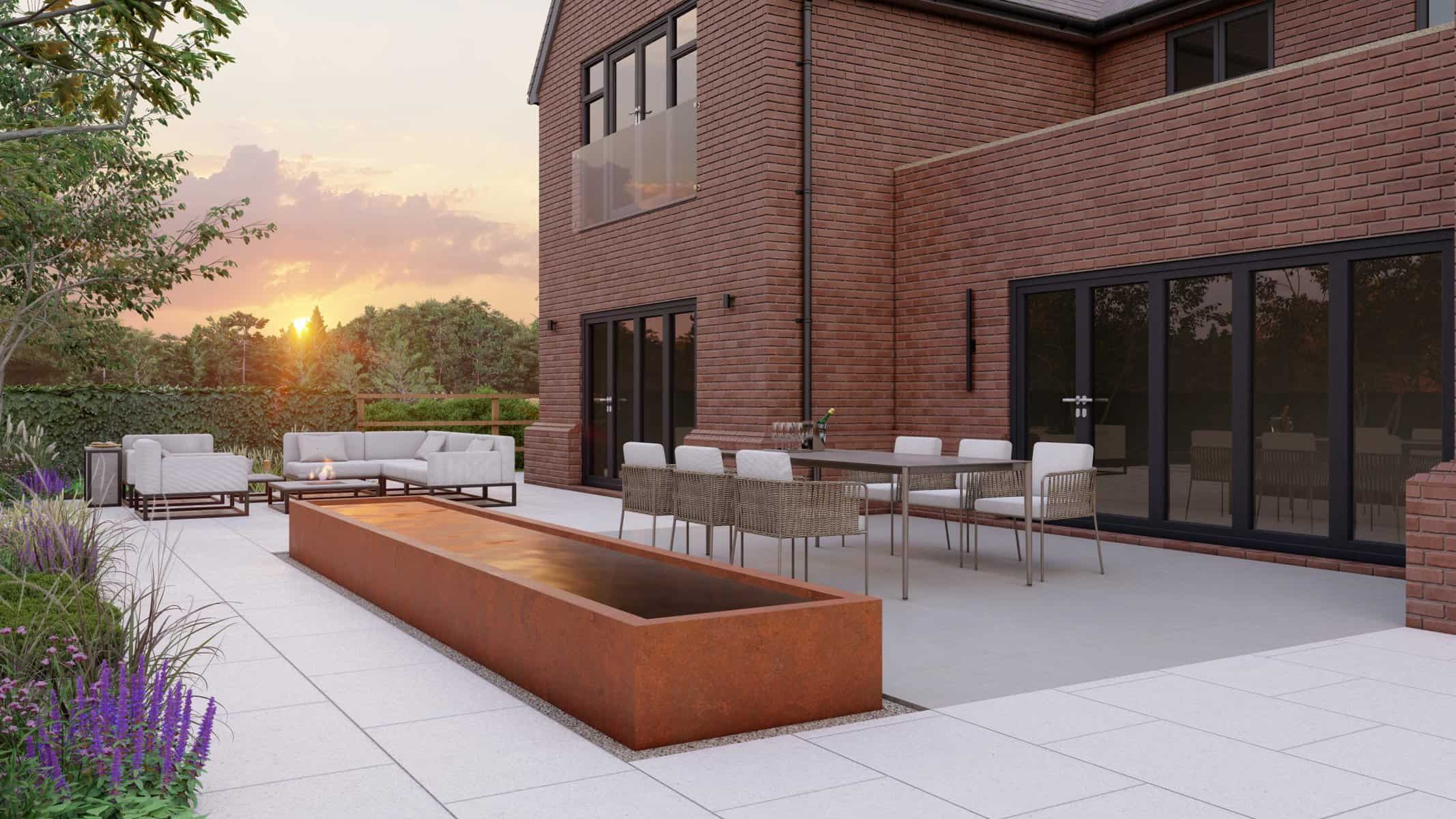 The detailed 3D renders offer you a panoramic view of this captivating space where luxury and nature blend effortlessly. The Corton Steel water feature centerpiece embodies a unique balance between the rustic allure of corten steel and the serene ambience created by flowing water, forming a compelling focal point in the landscape.