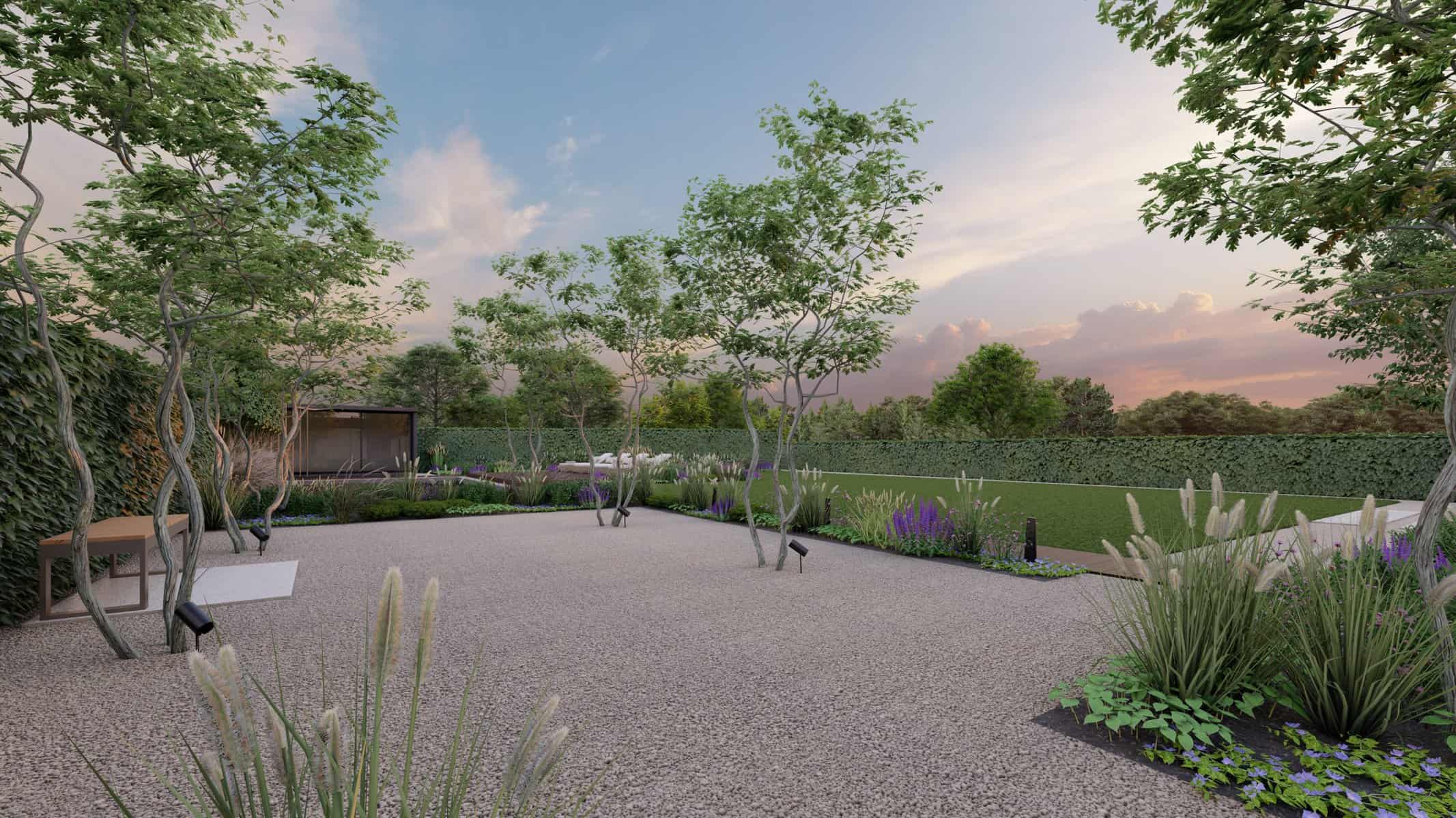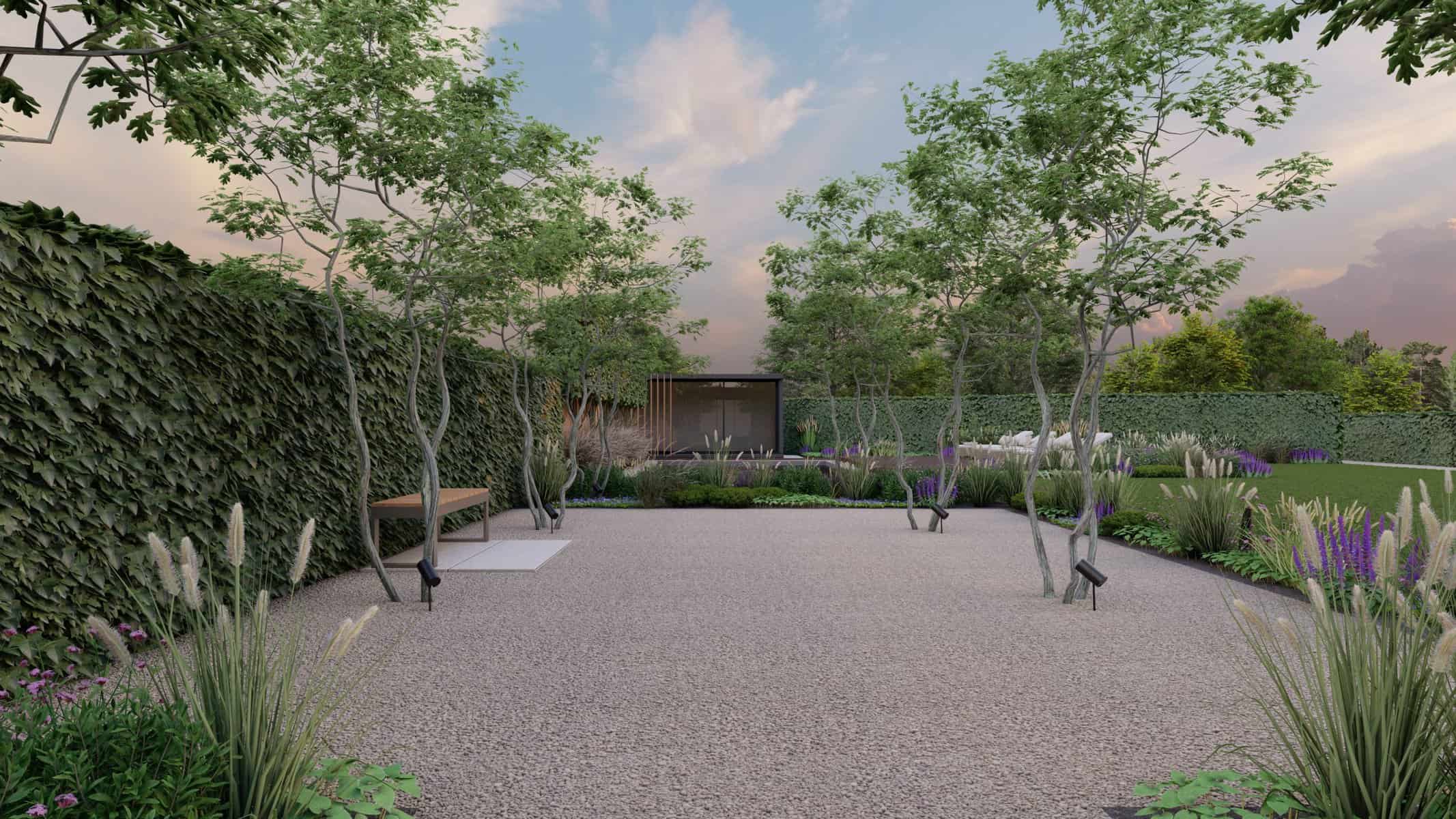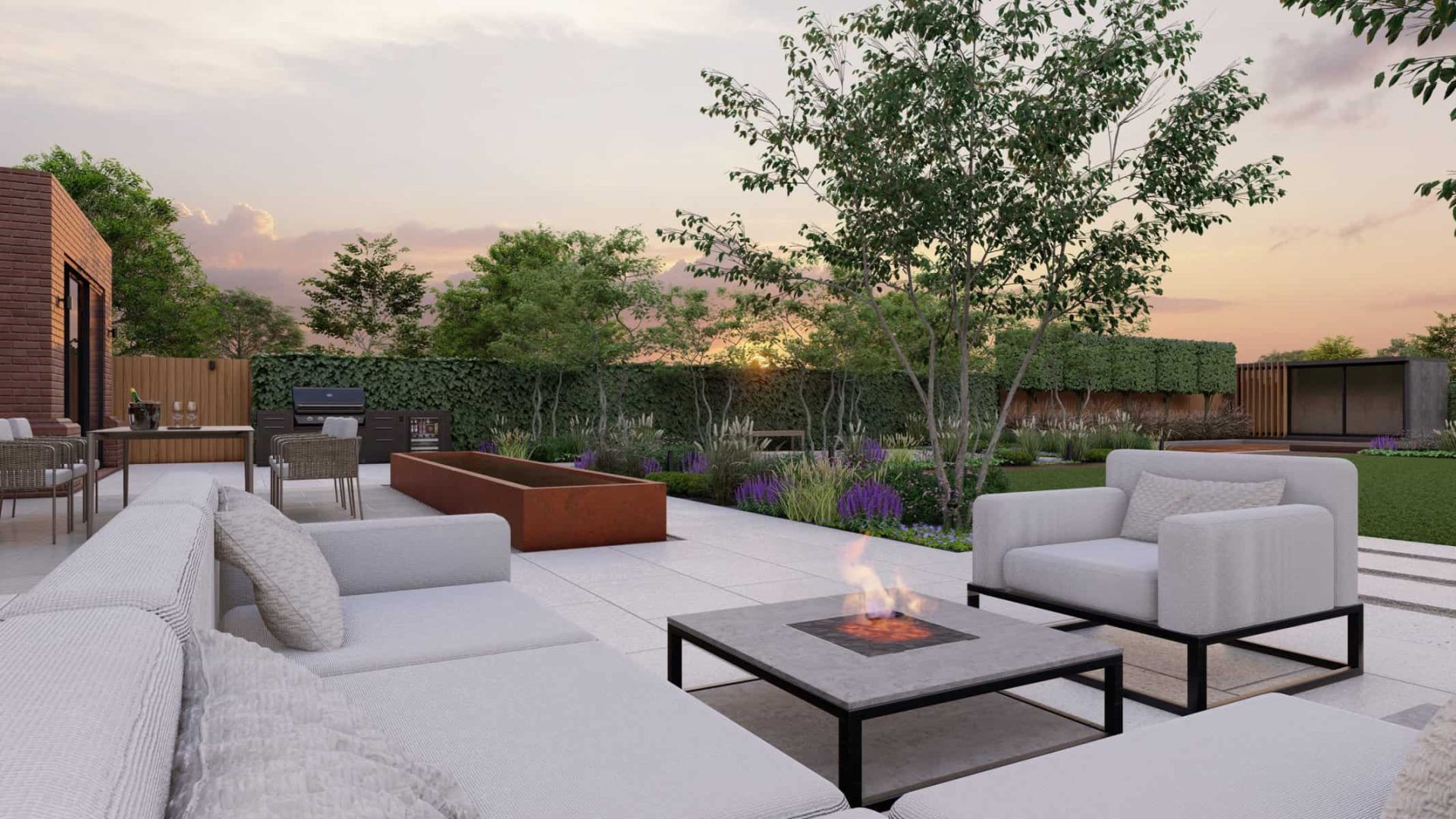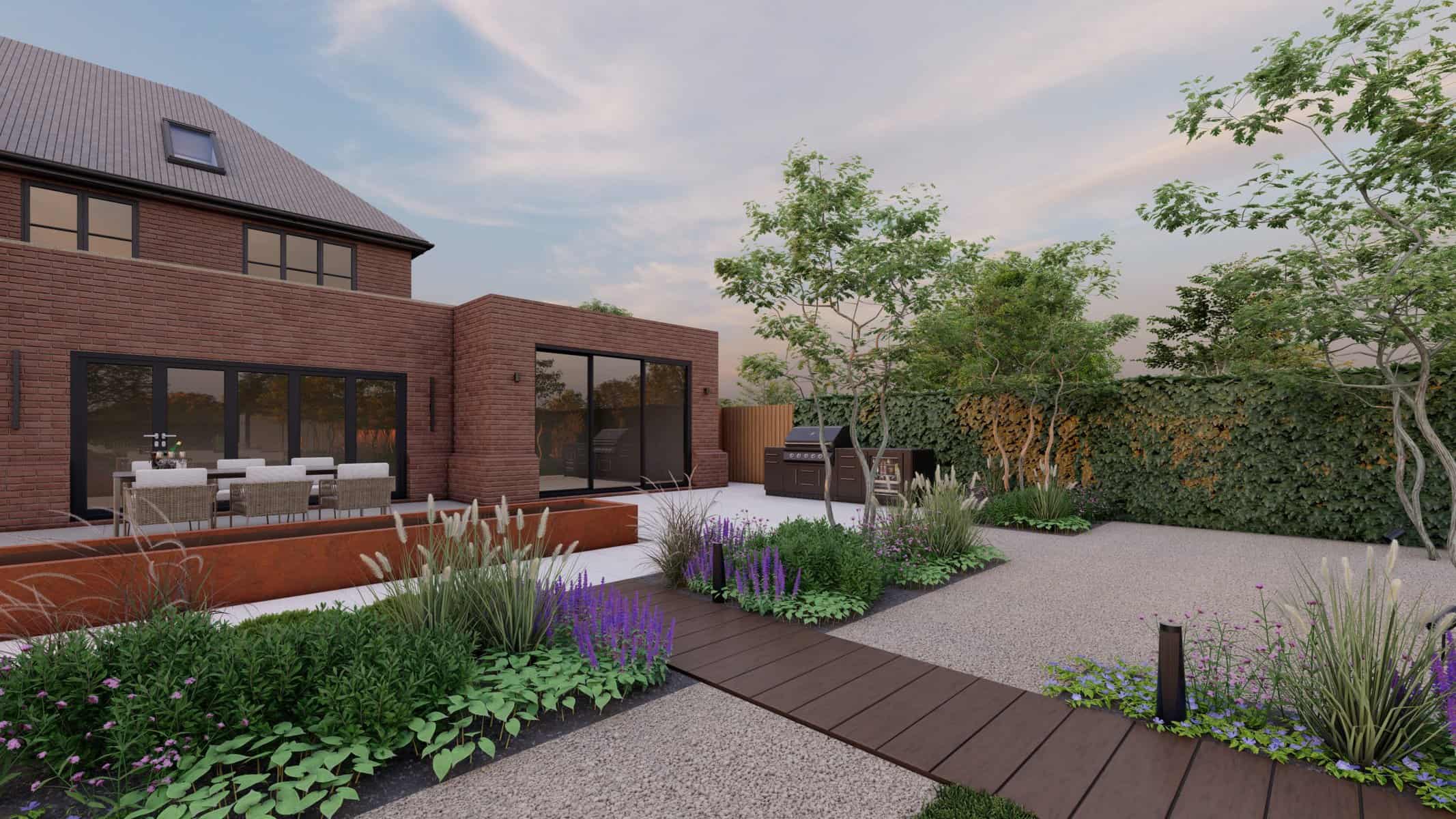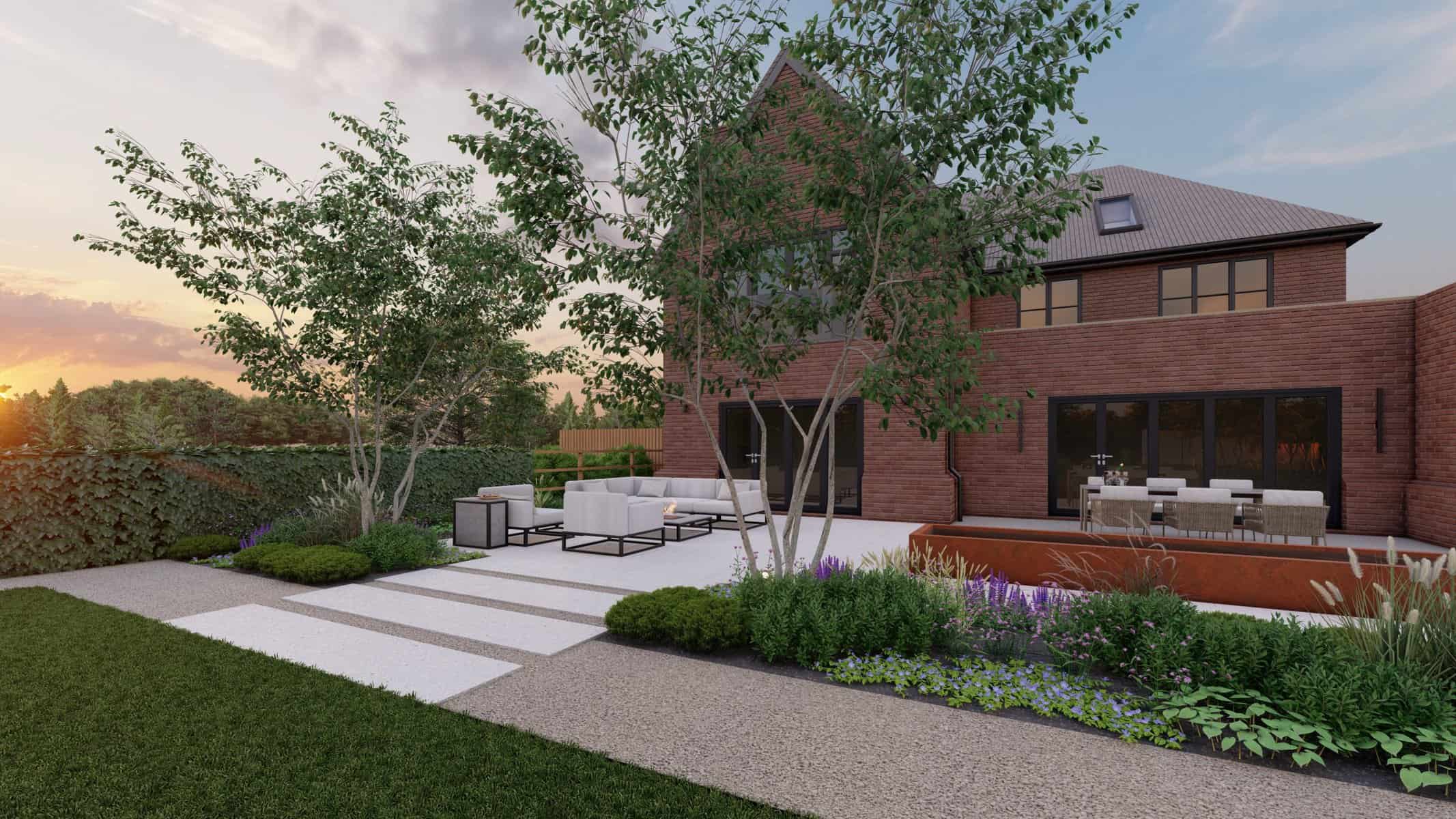 The detailed 3D renders offer you a panoramic view of this captivating space where luxury and nature blend effortlessly. The Corton Steel water feature centerpiece embodies a unique balance between the rustic allure of corten steel and the serene ambience created by flowing water, forming a compelling focal point in the landscape.