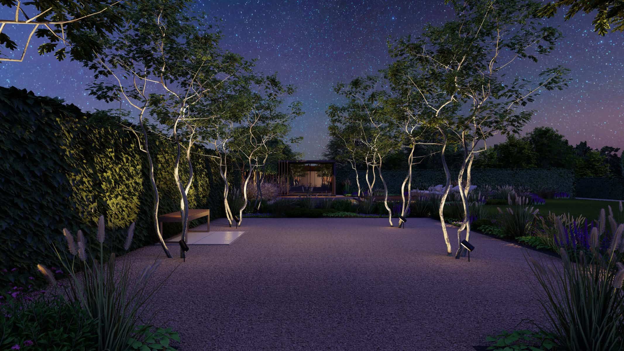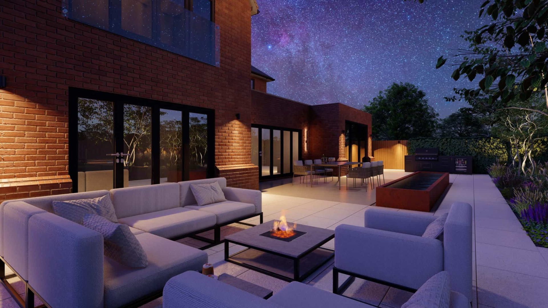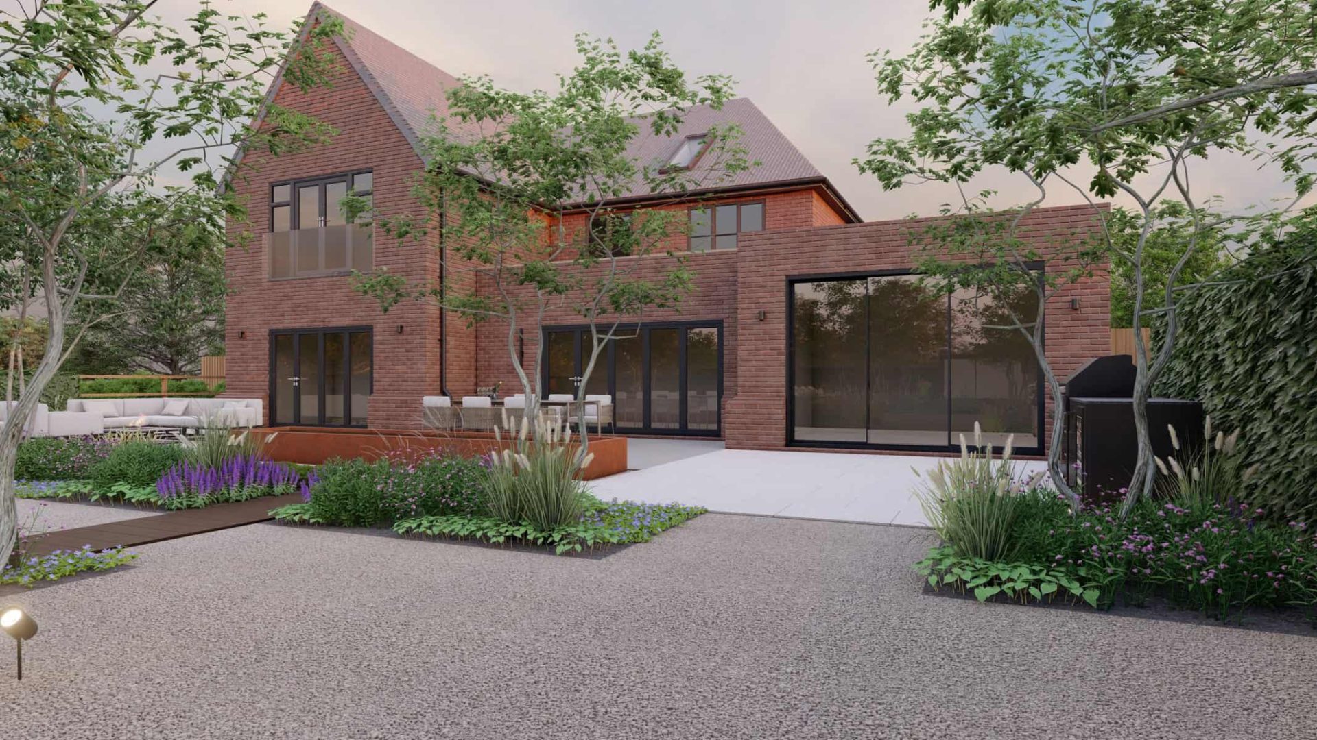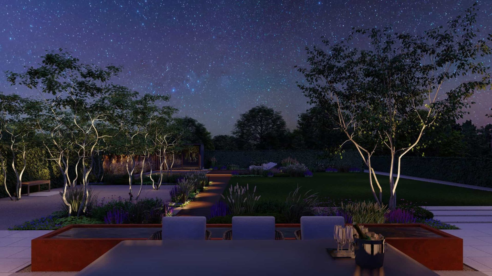 The detailed 3D renders offer you a panoramic view of this captivating space where luxury and nature blend effortlessly. The Corton Steel water feature centerpiece embodies a unique balance between the rustic allure of corten steel and the serene ambience created by flowing water, forming a compelling focal point in the landscape.