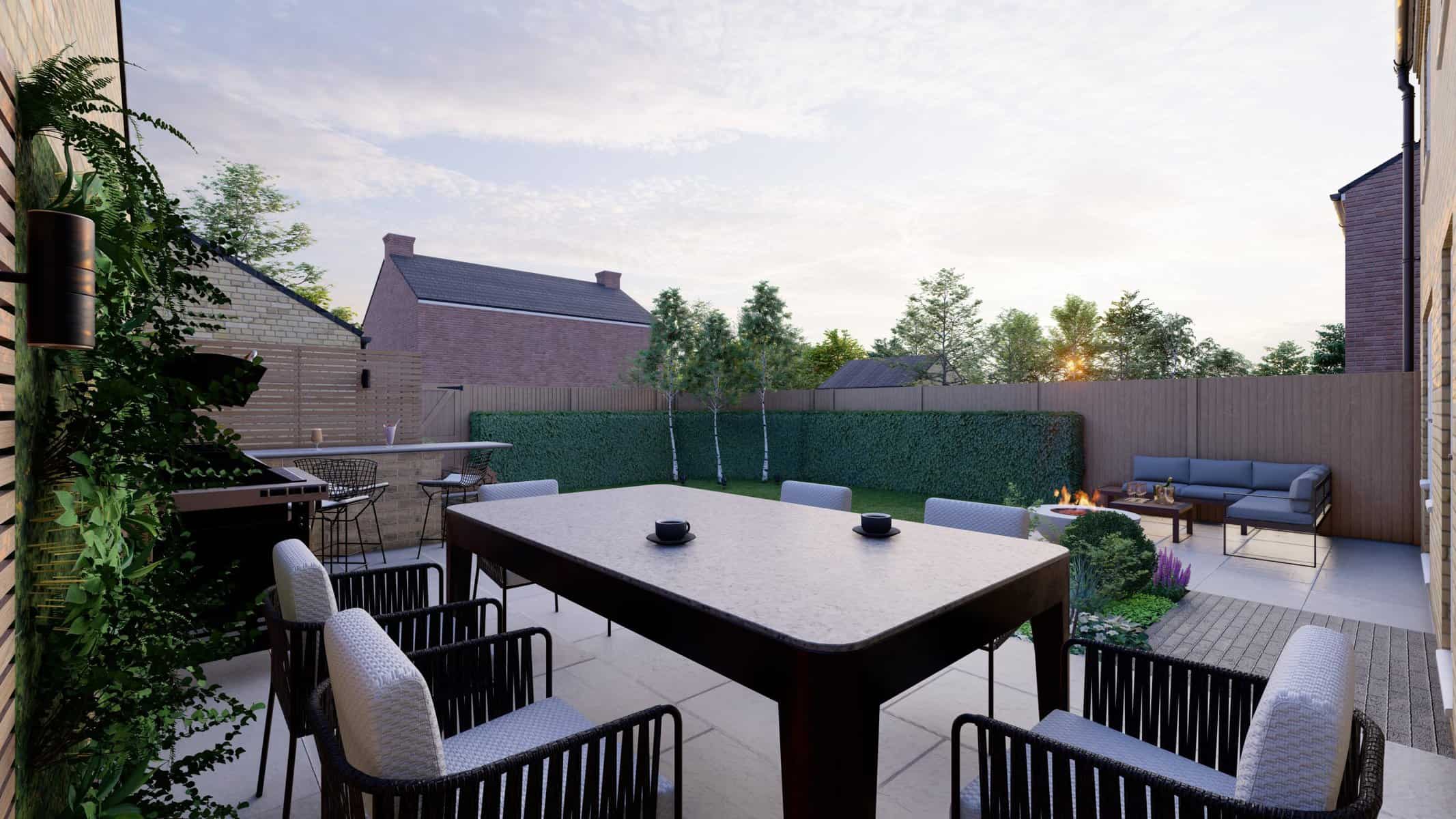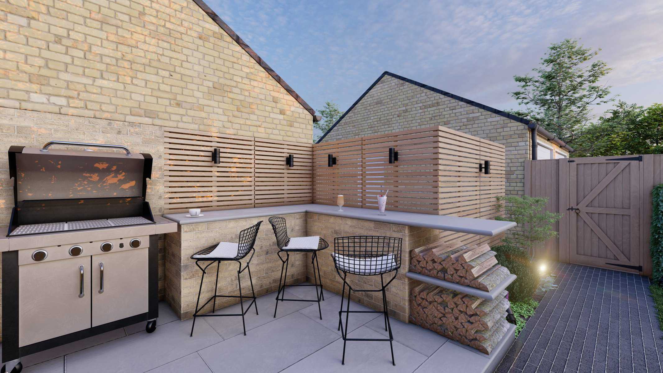 As you follow these paths, you’ll find the garden’s social hub, a chic outdoor bar complete with a high-quality barbecue. The 3D renders capture how seamlessly this space integrates with the landscape, presenting an ideal spot for outdoor entertaining and culinary adventures.