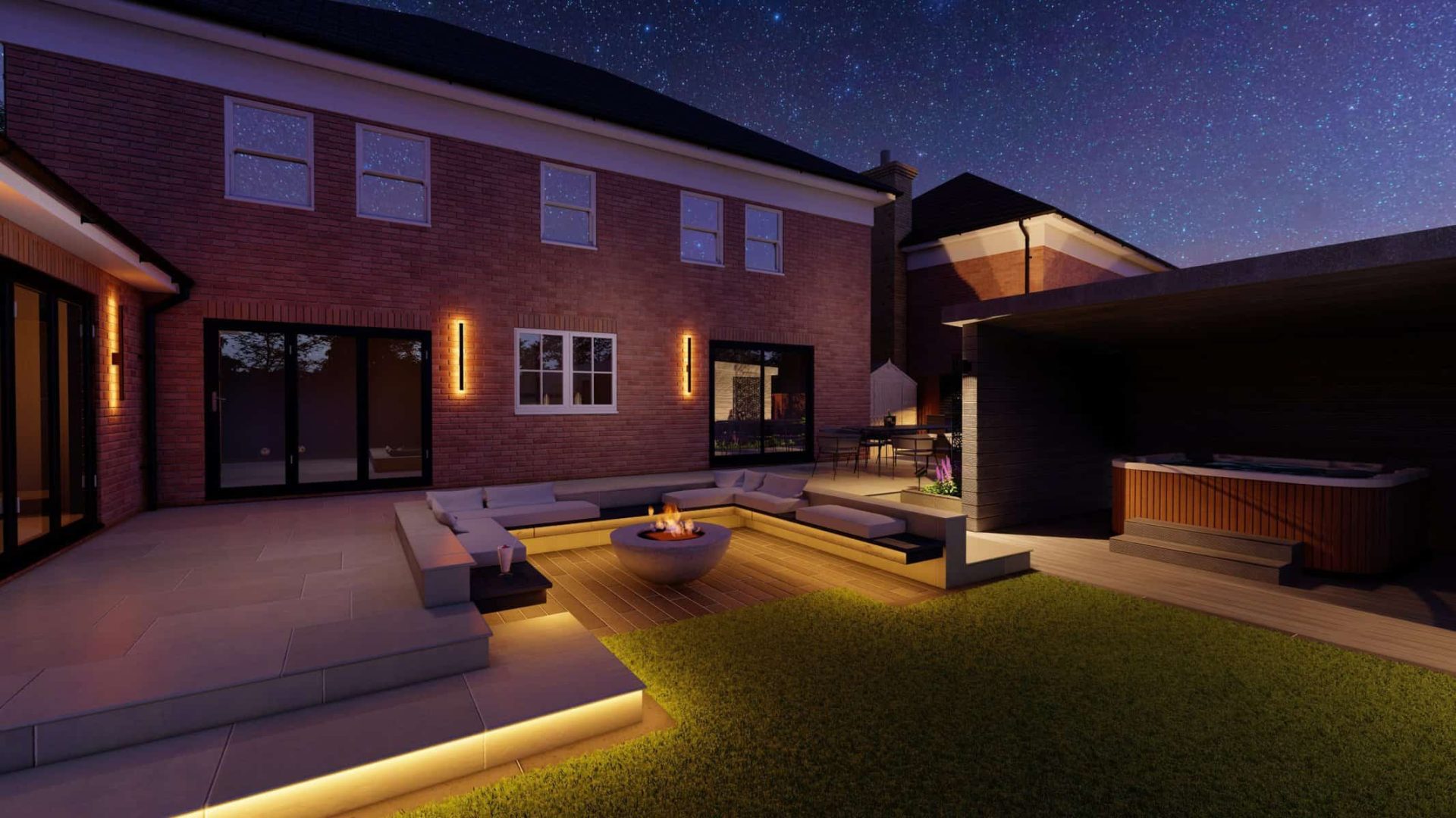 Just steps away, you’ll find a standout addition – a dedicated building housing a luxurious hot tub. Outfitted with bi-fold doors, this space effortlessly connects the indoors with the out, providing an uninterrupted view of the garden while ensuring year-round protection from the elements.