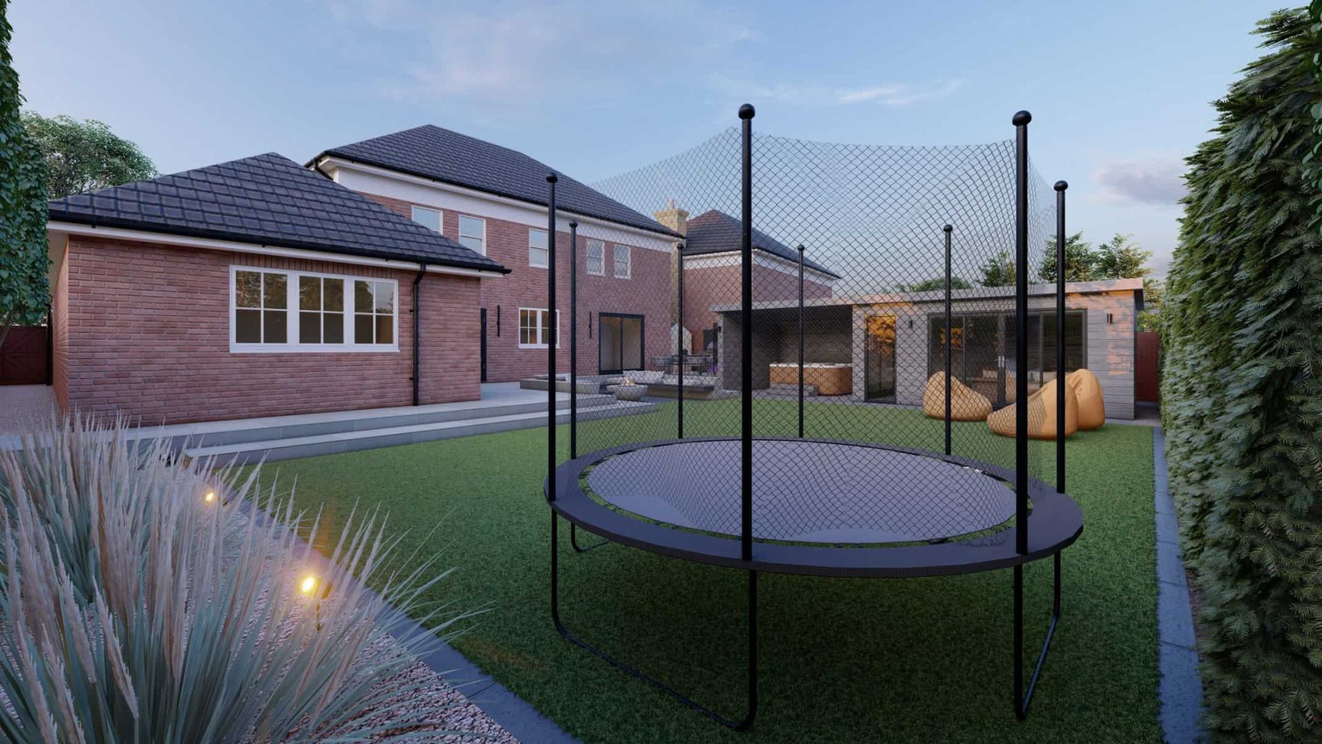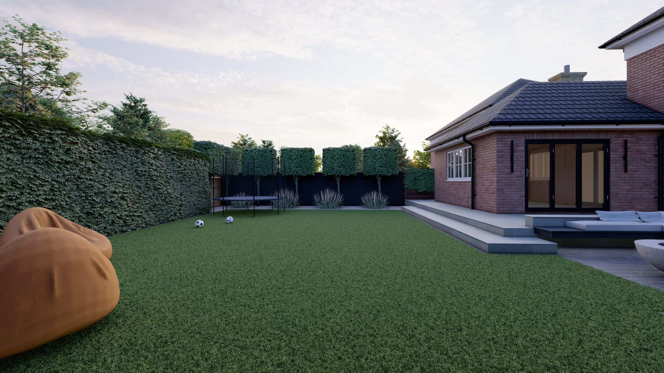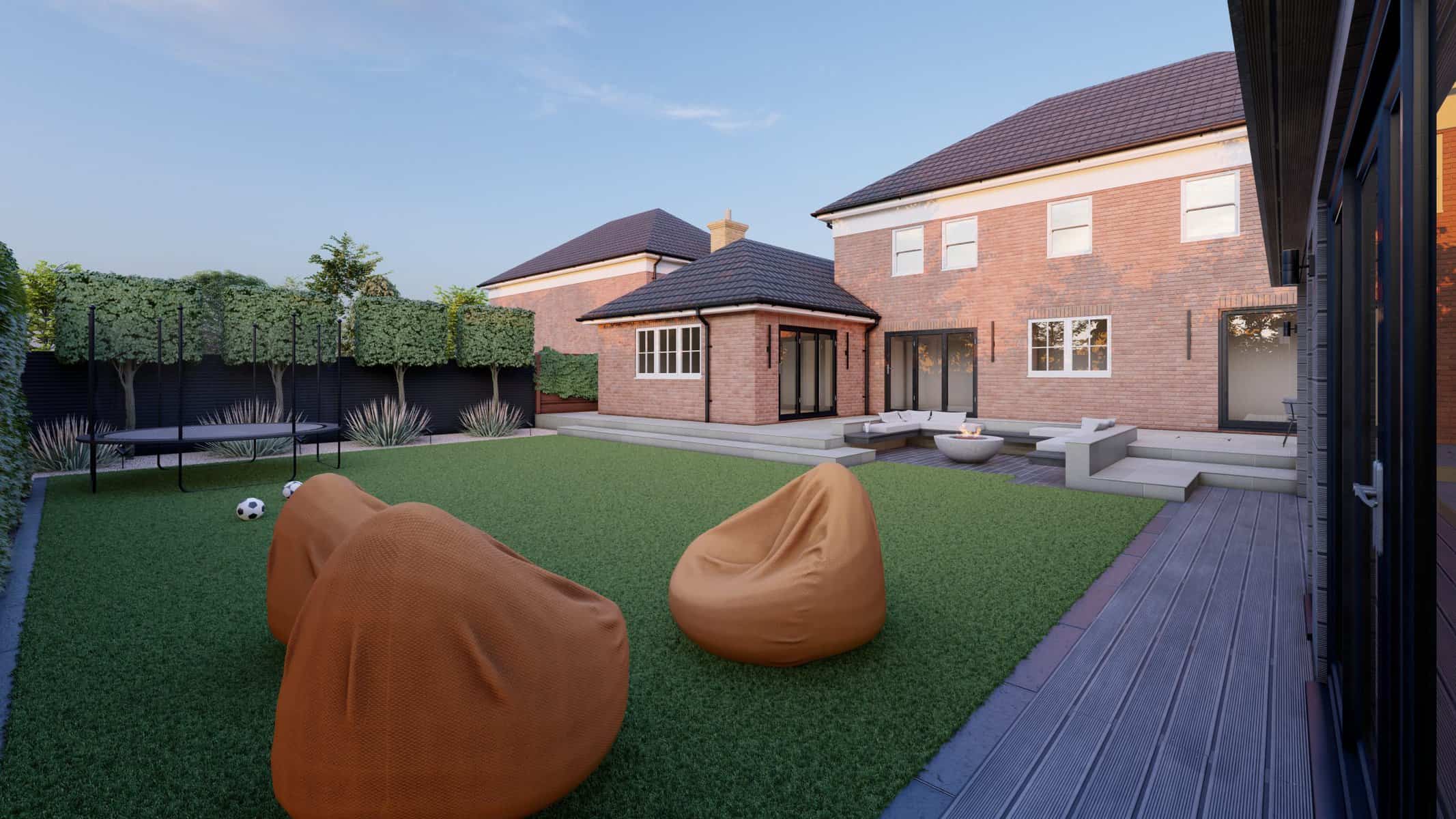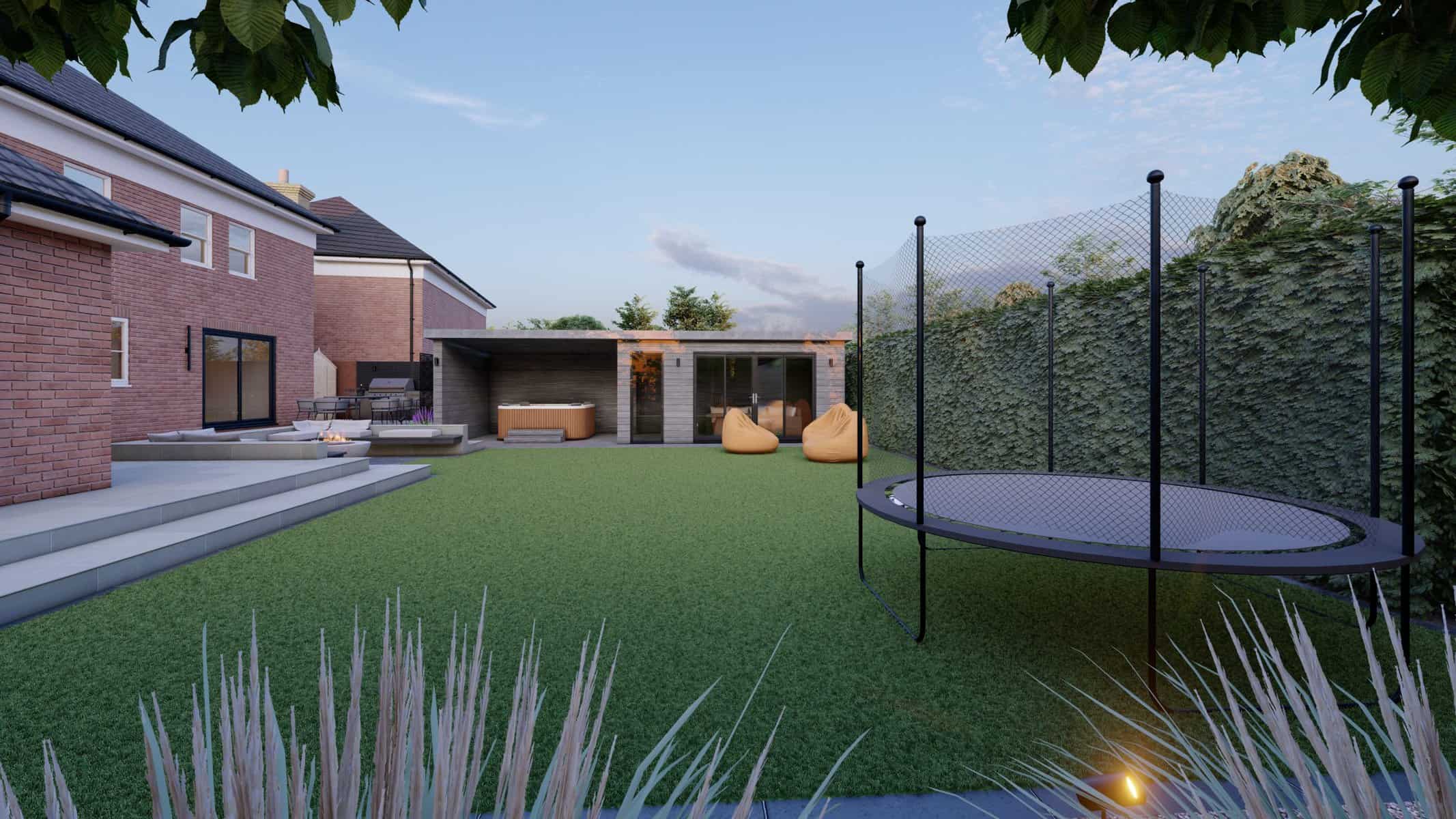 For younger members of the family, the garden offers a world of fun. The vibrant artificial lawn is a durable, low-maintenance solution perfect for energetic playtimes. Nearby, a trampoline stands ready to bounce into action, providing hours of joyful exercise and laughter.