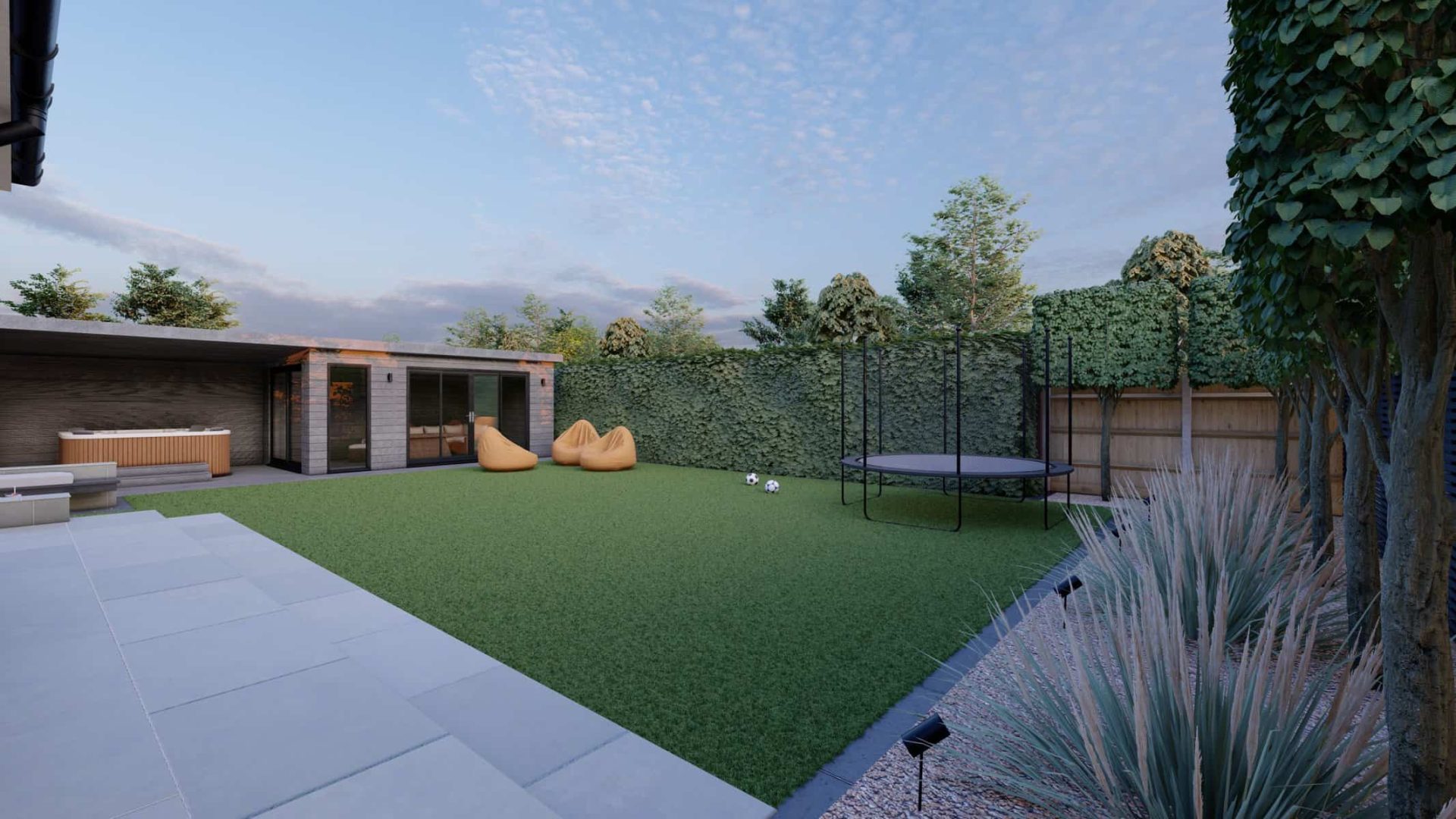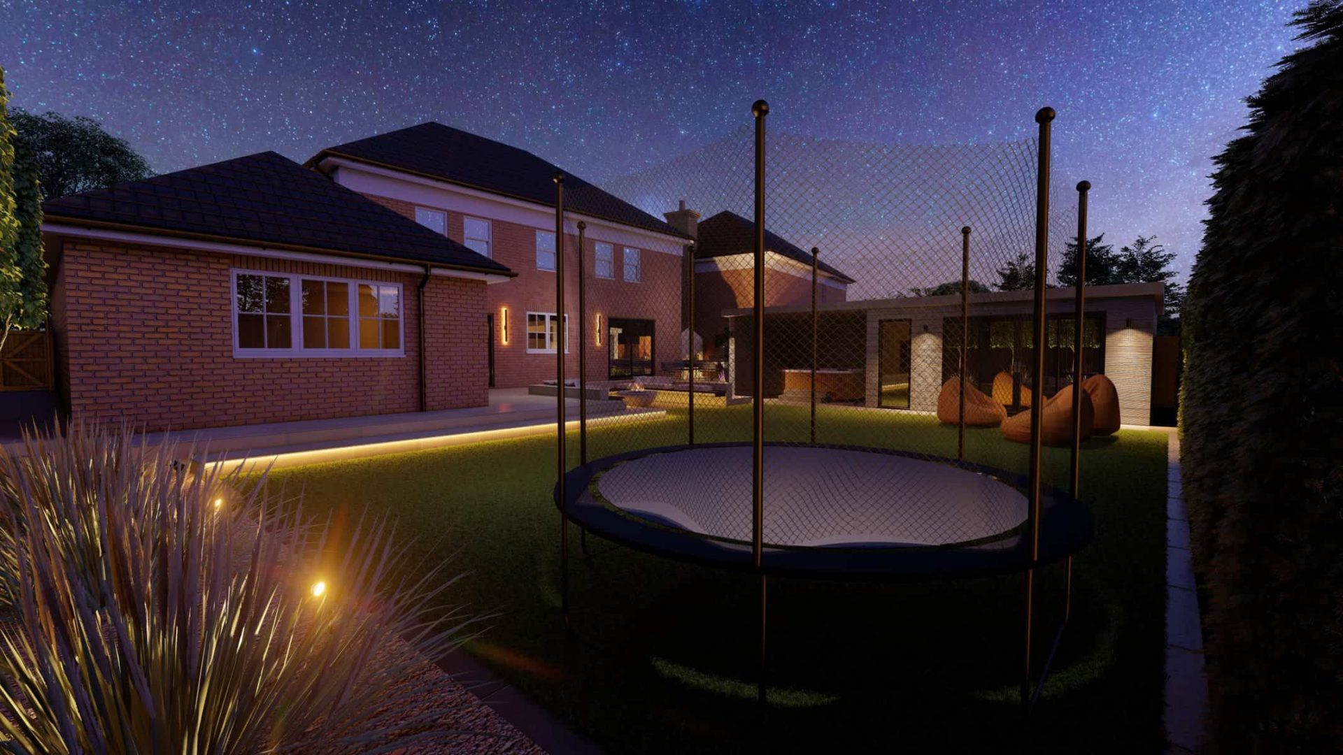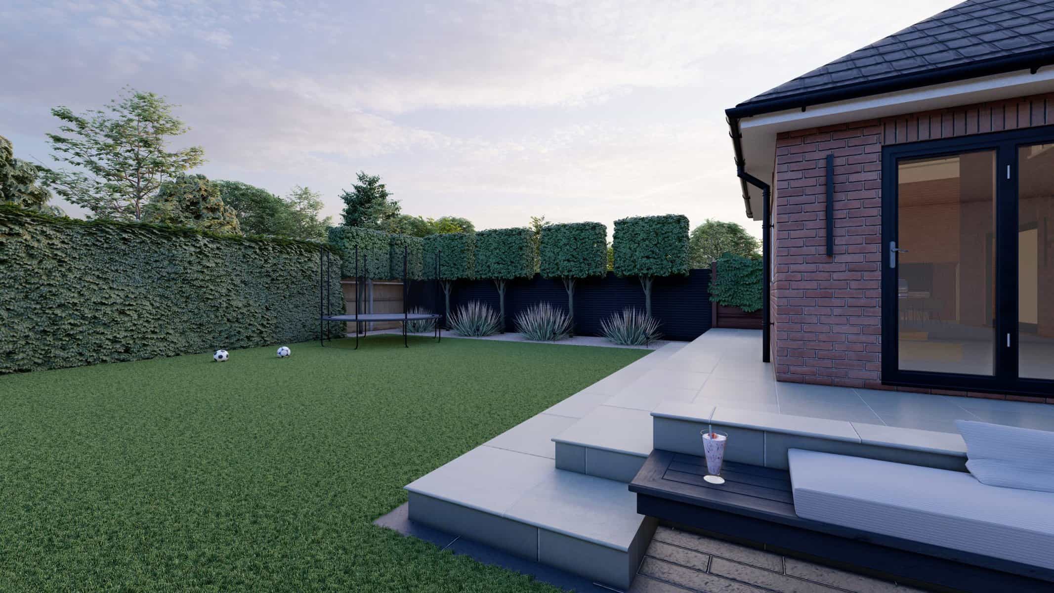 For younger members of the family, the garden offers a world of fun. The vibrant artificial lawn is a durable, low-maintenance solution perfect for energetic playtimes. Nearby, a trampoline stands ready to bounce into action, providing hours of joyful exercise and laughter.