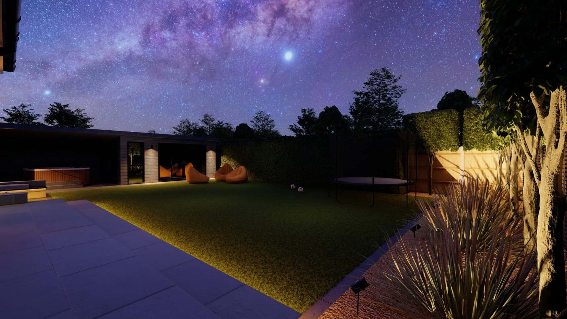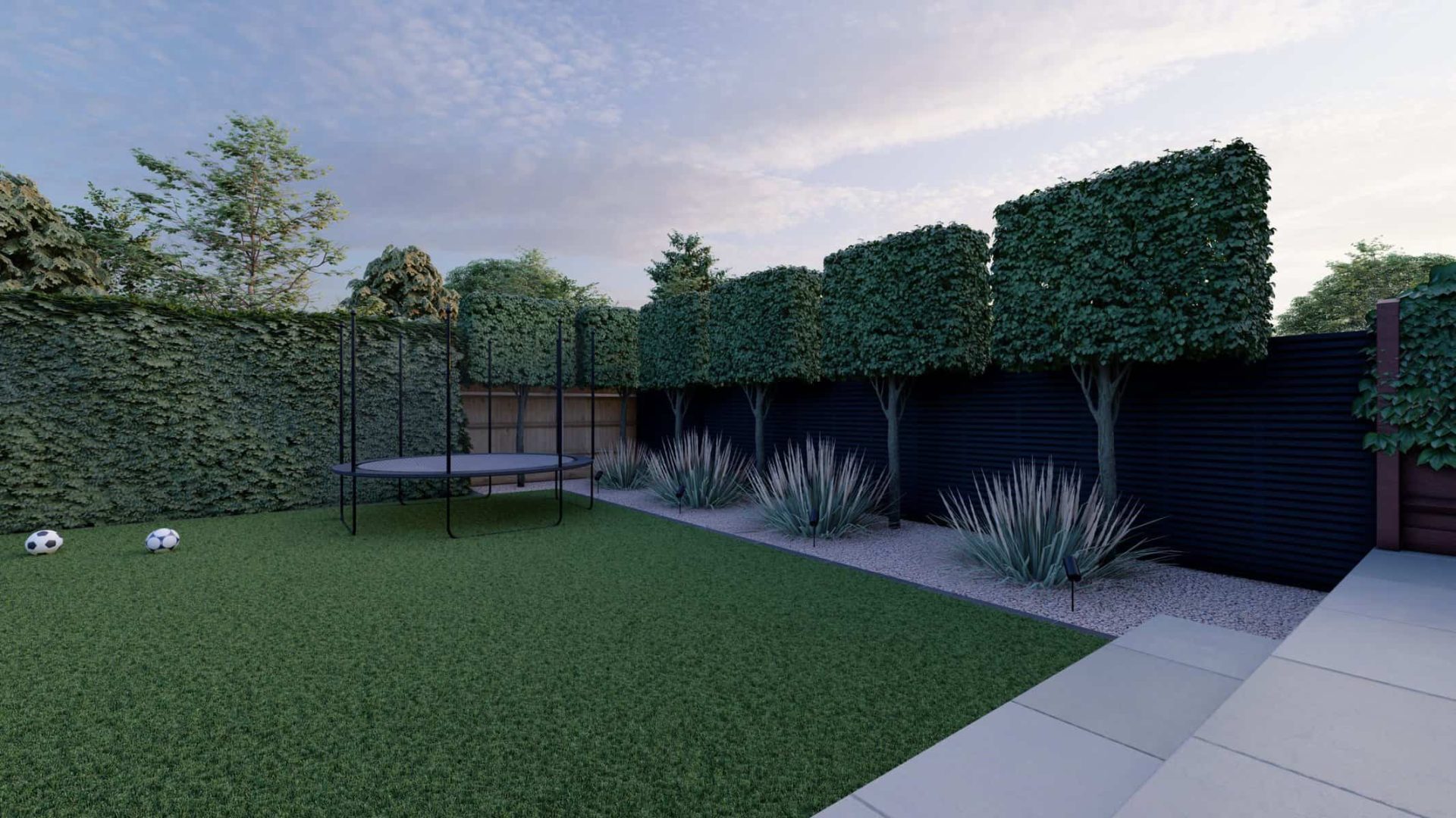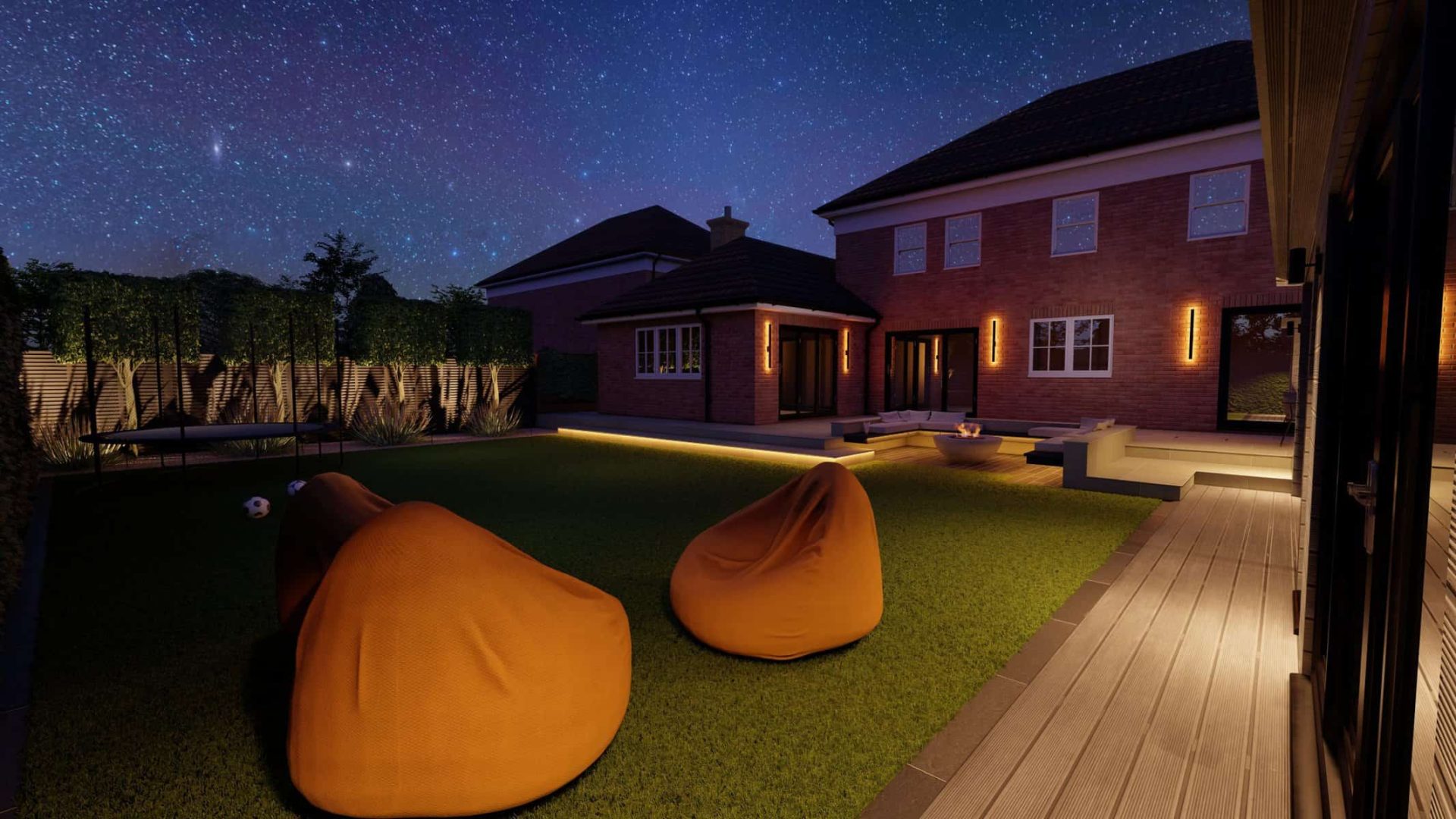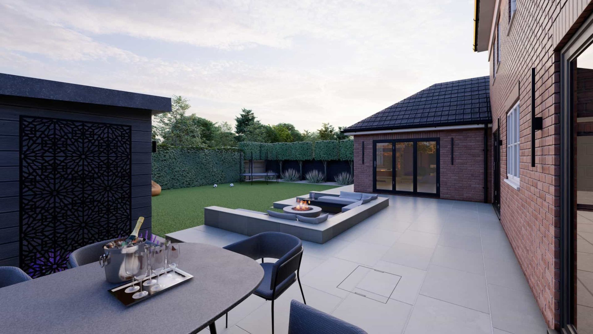 For younger members of the family, the garden offers a world of fun. The vibrant artificial lawn is a durable, low-maintenance solution perfect for energetic playtimes. Nearby, a trampoline stands ready to bounce into action, providing hours of joyful exercise and laughter.