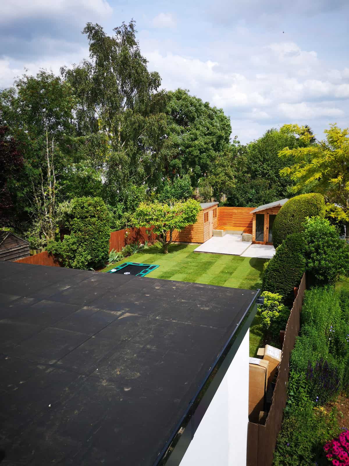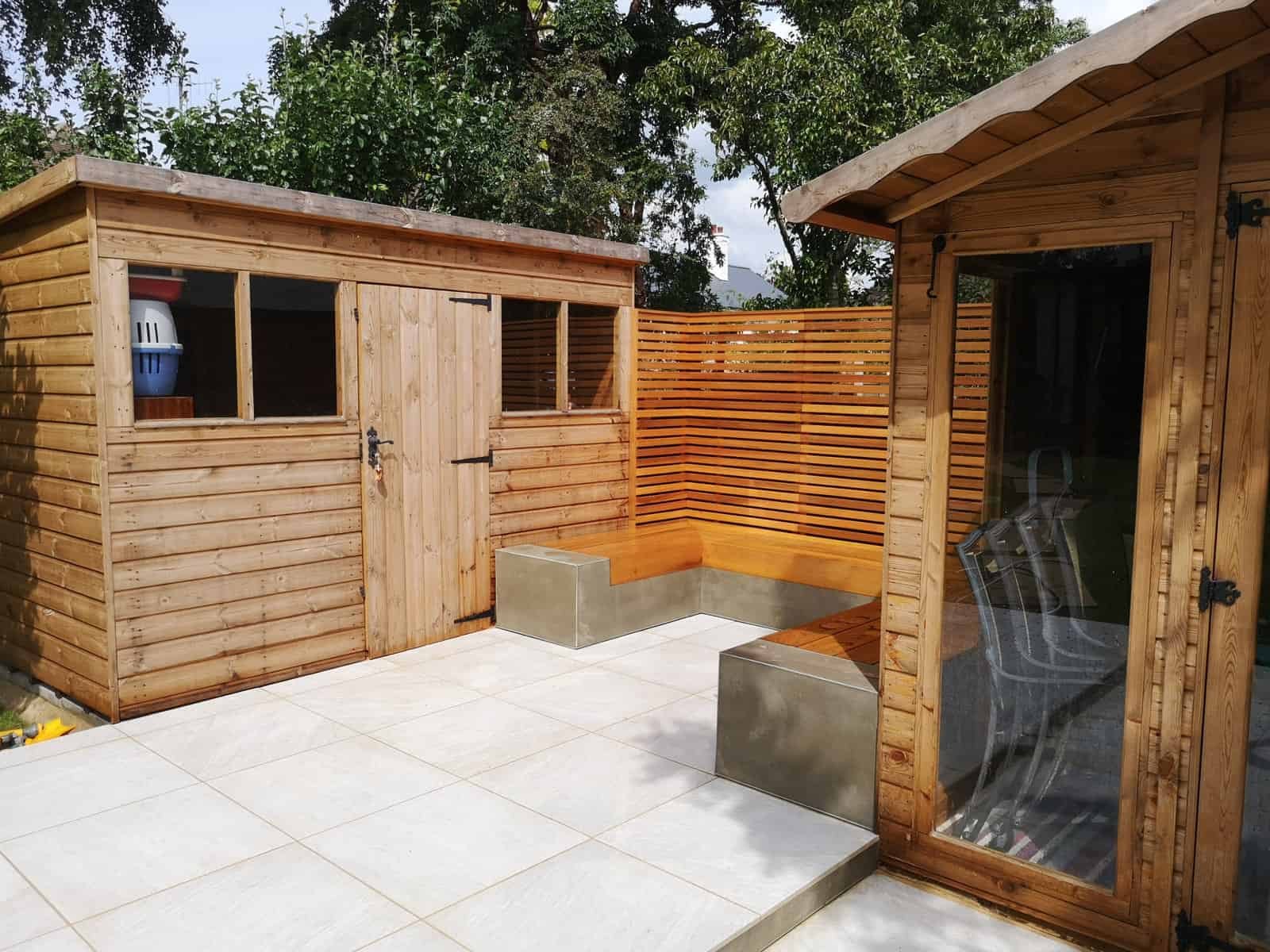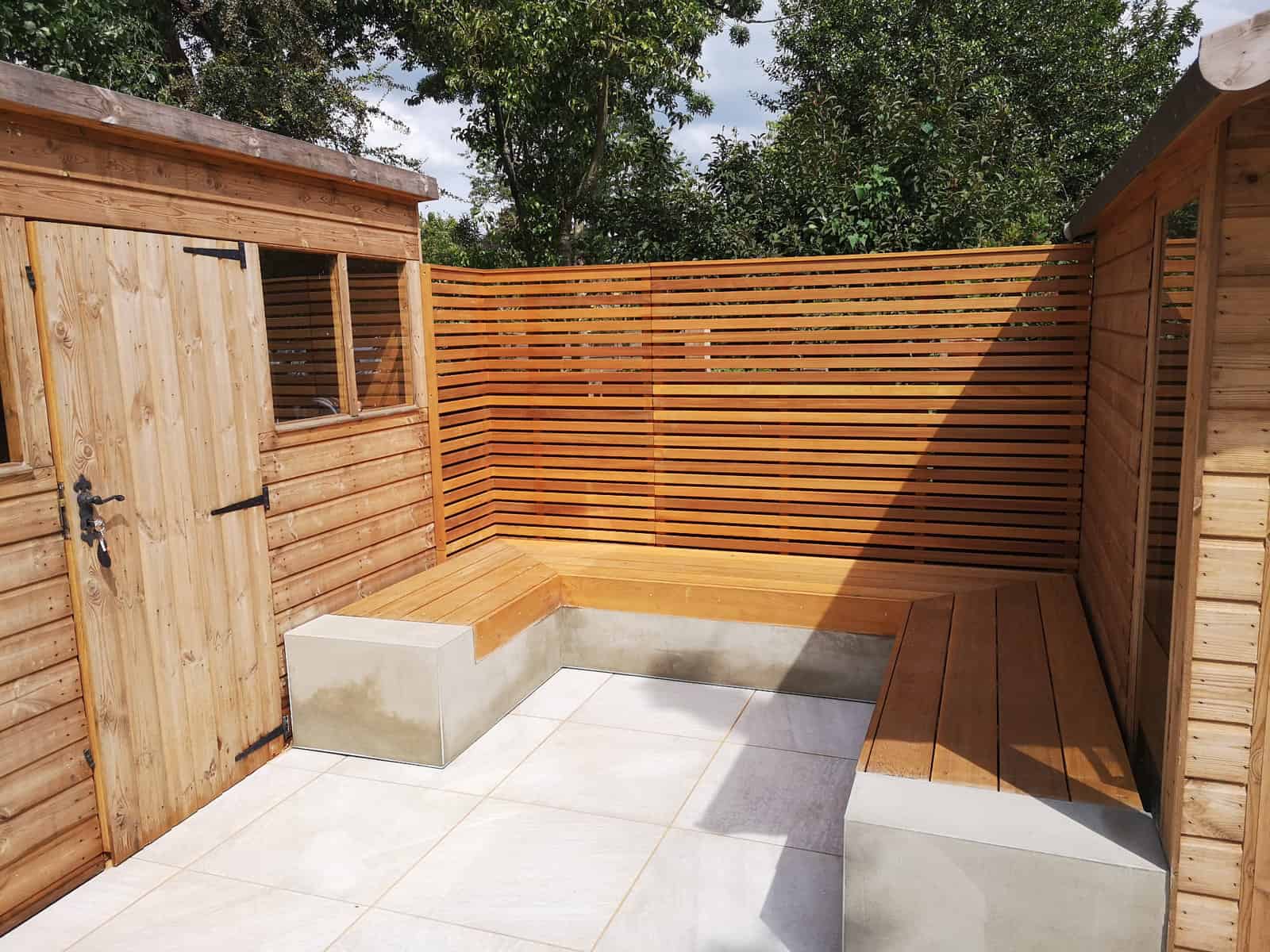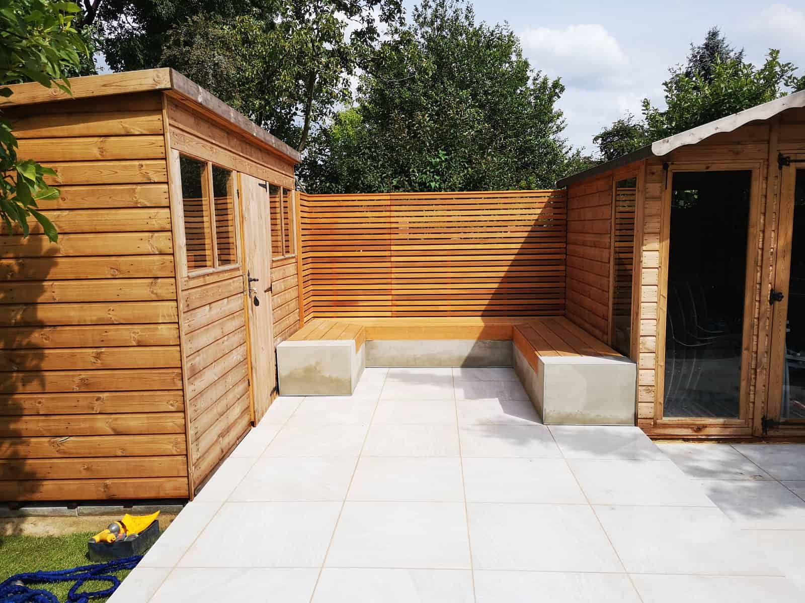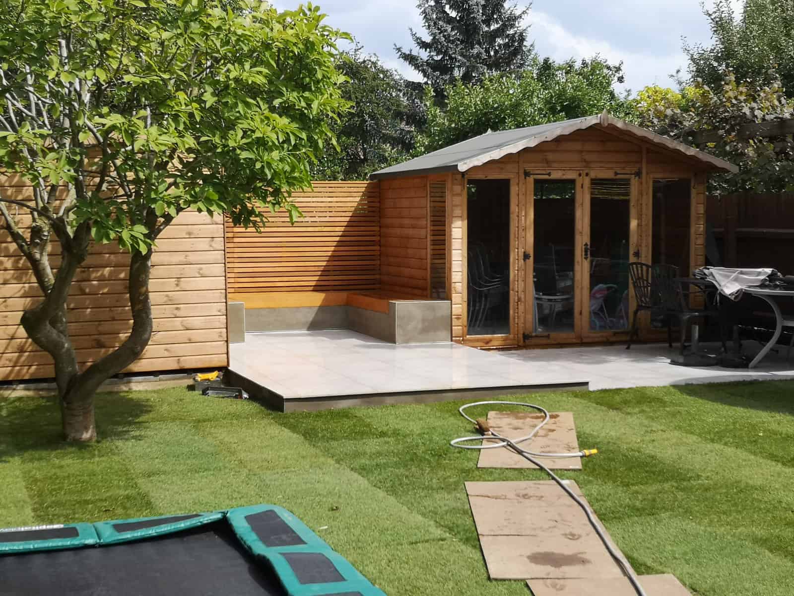 We strategically installed a bespoke seating area at the rear of the garden to bask in the warmth of the sun, transforming it into a prime spot for lounging, reading, or sharing conversations. This comfortable retreat serves as the perfect platform for adults to unwind and watch over the little ones at play.