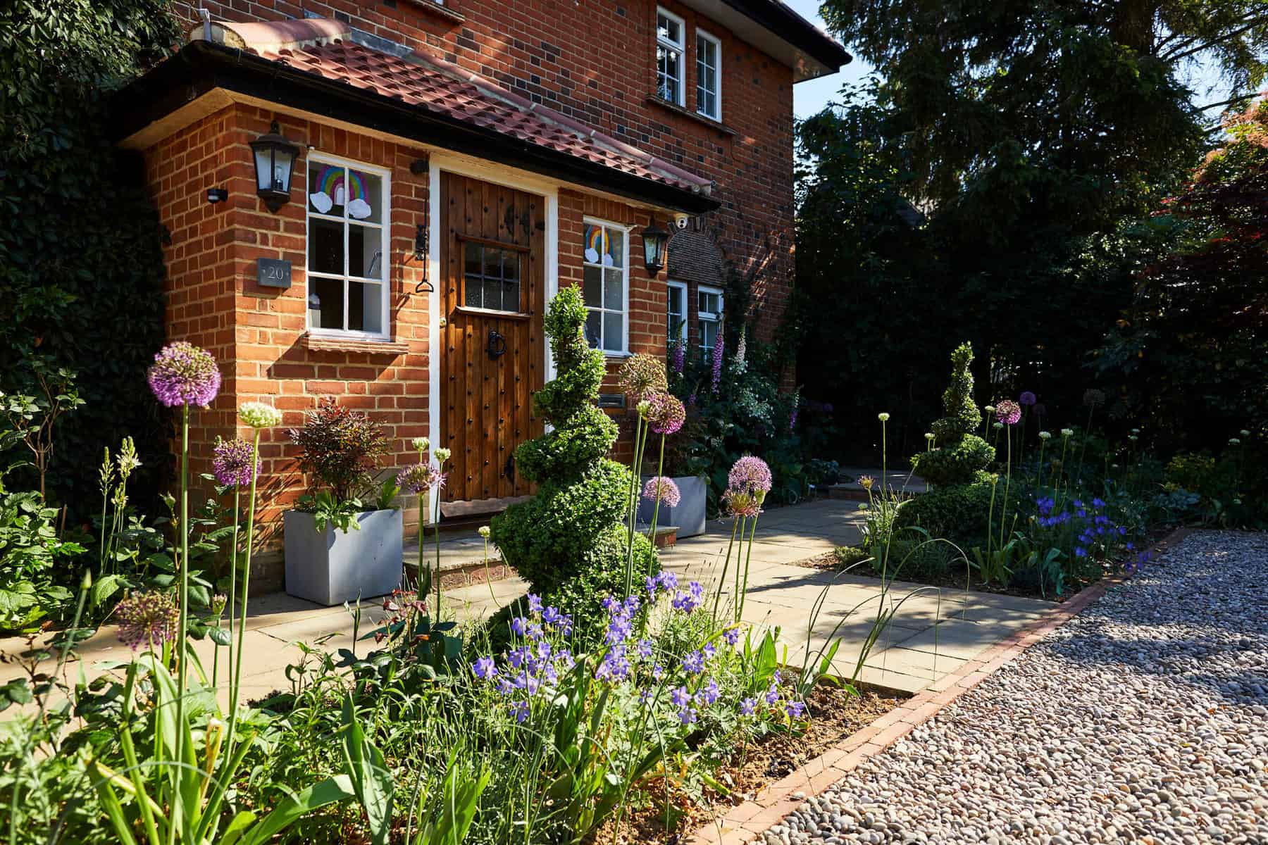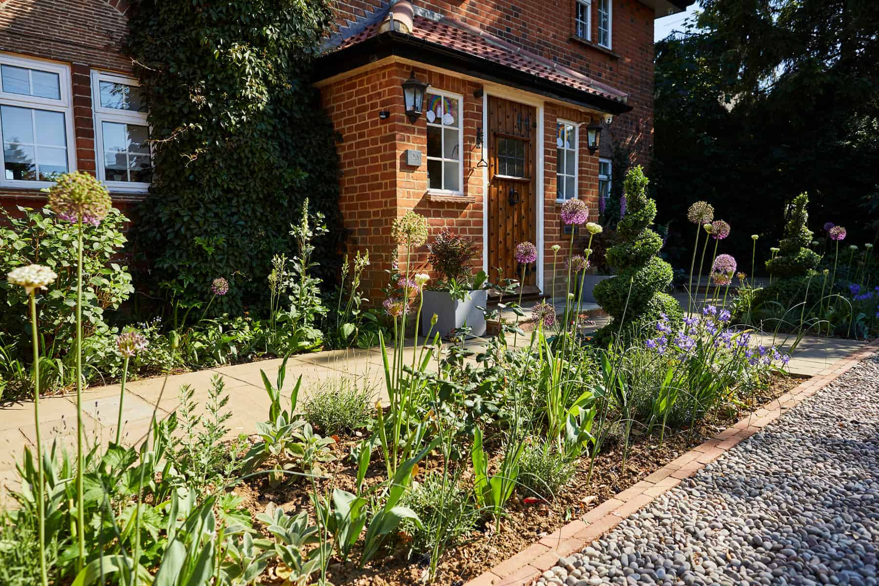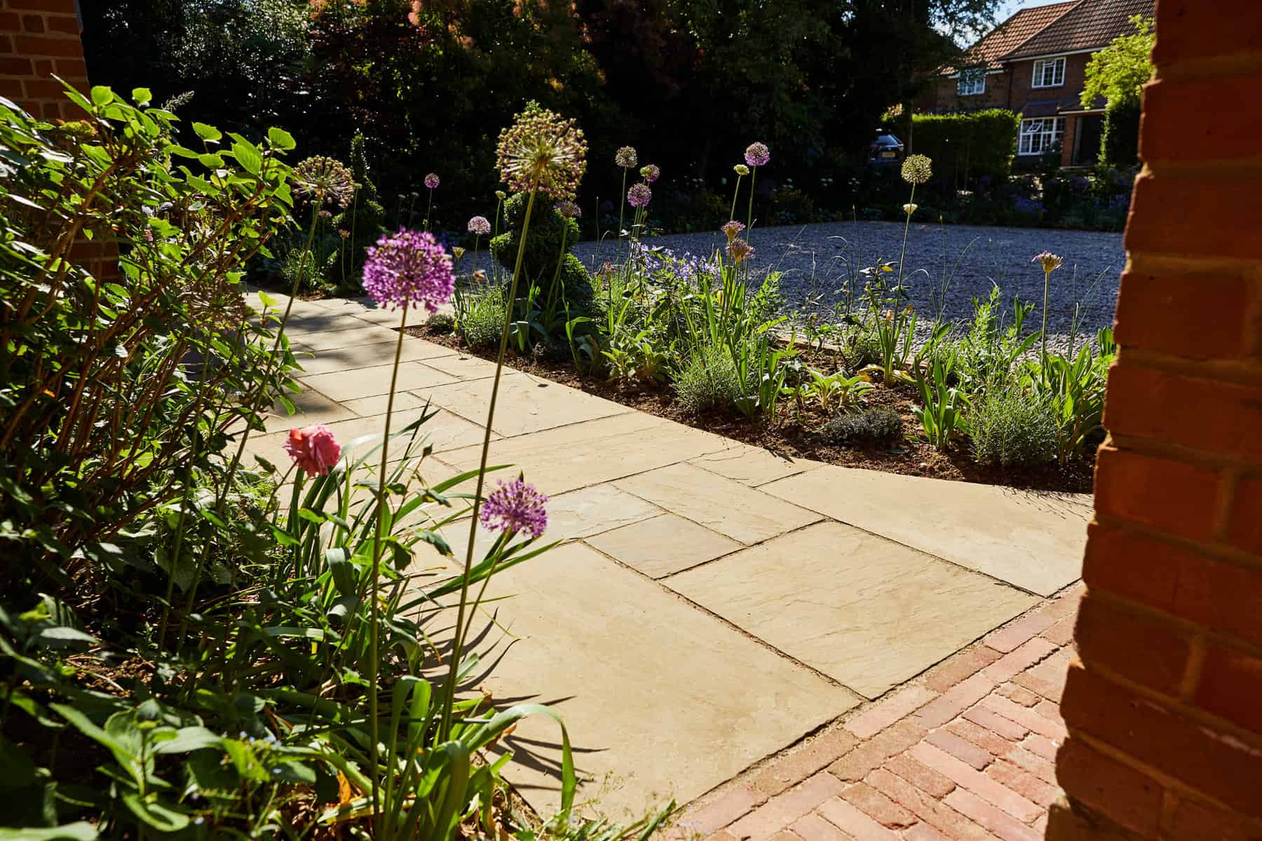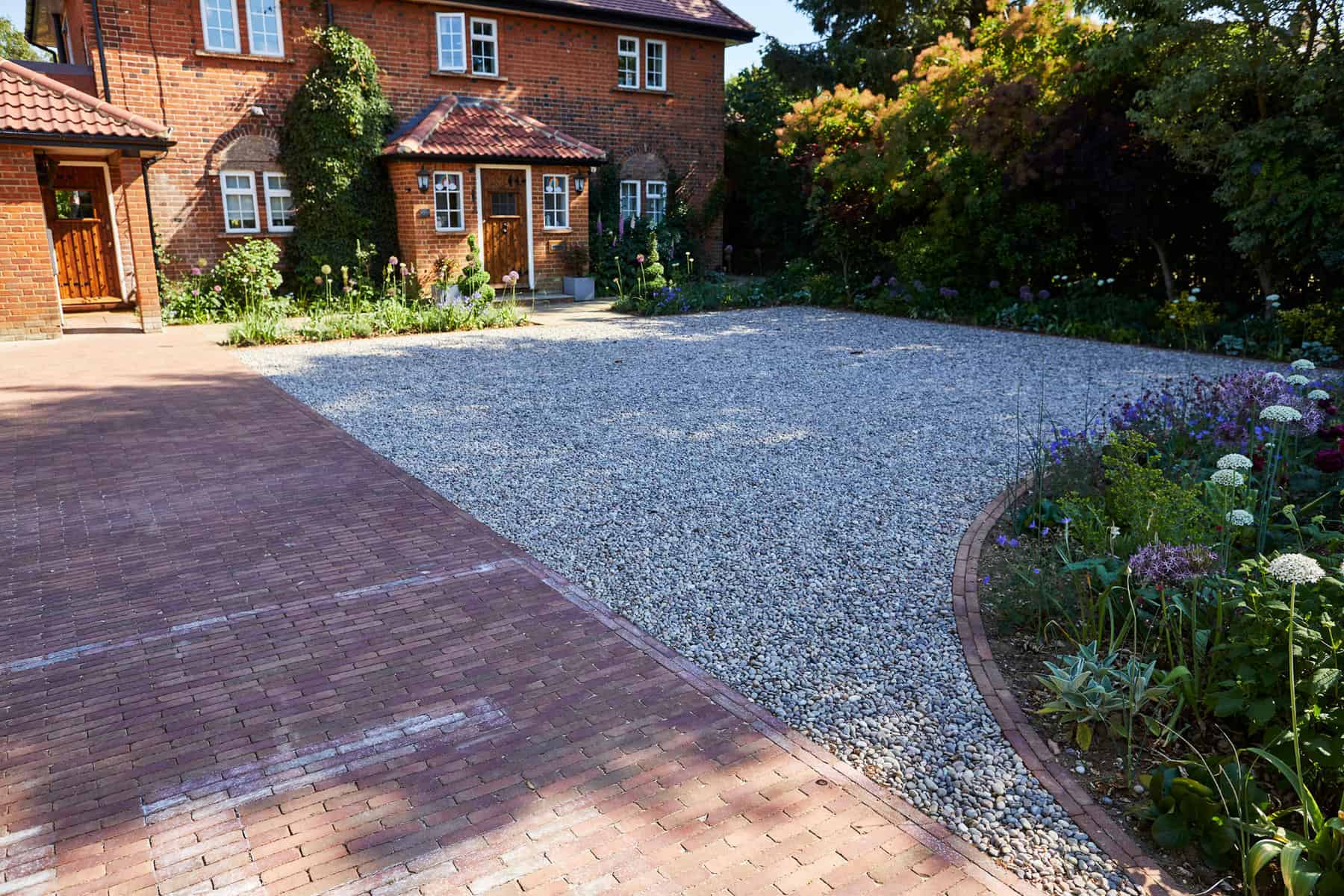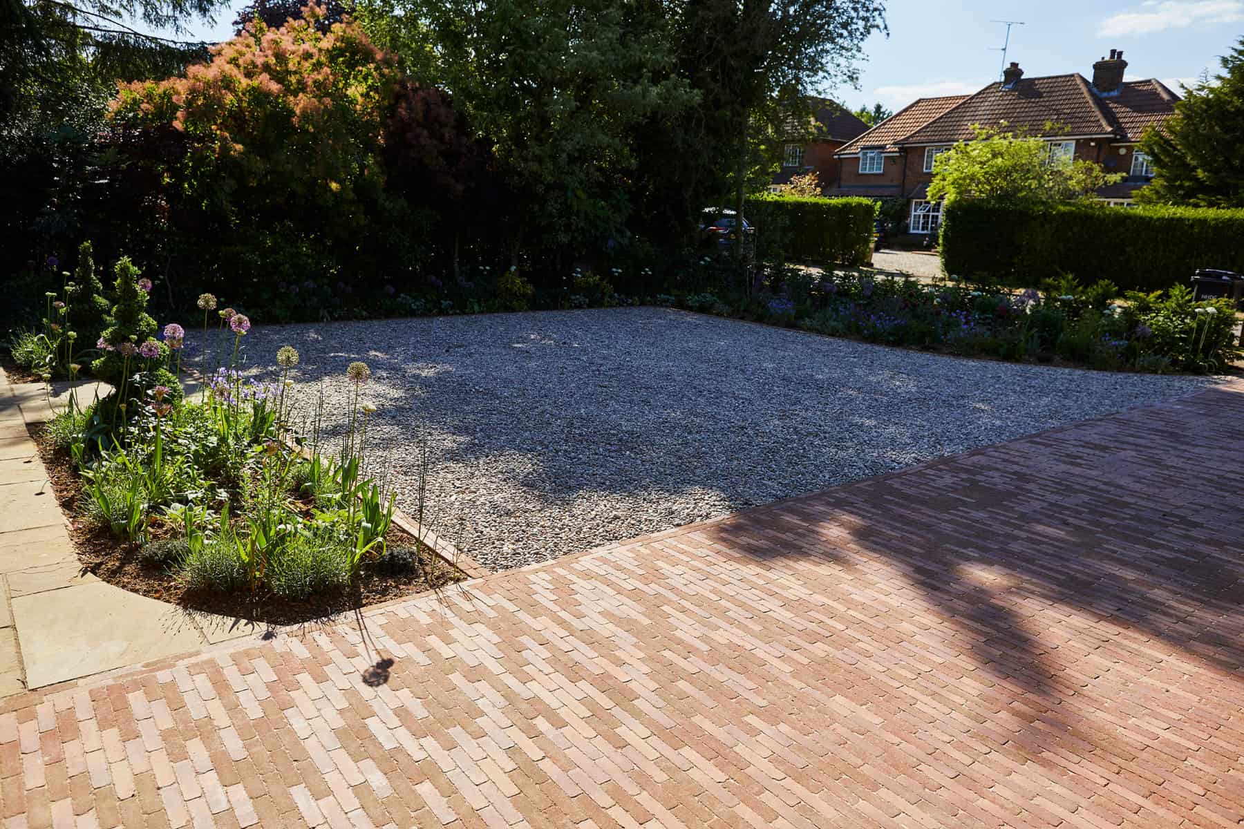 A large-scale front garden transformation in Knebworth, masterminded to accommodate ample parking space while preserving the area’s natural charm. To strike a balance, we incorporated strategic planting borders, creating green pockets within the extensive paved area.