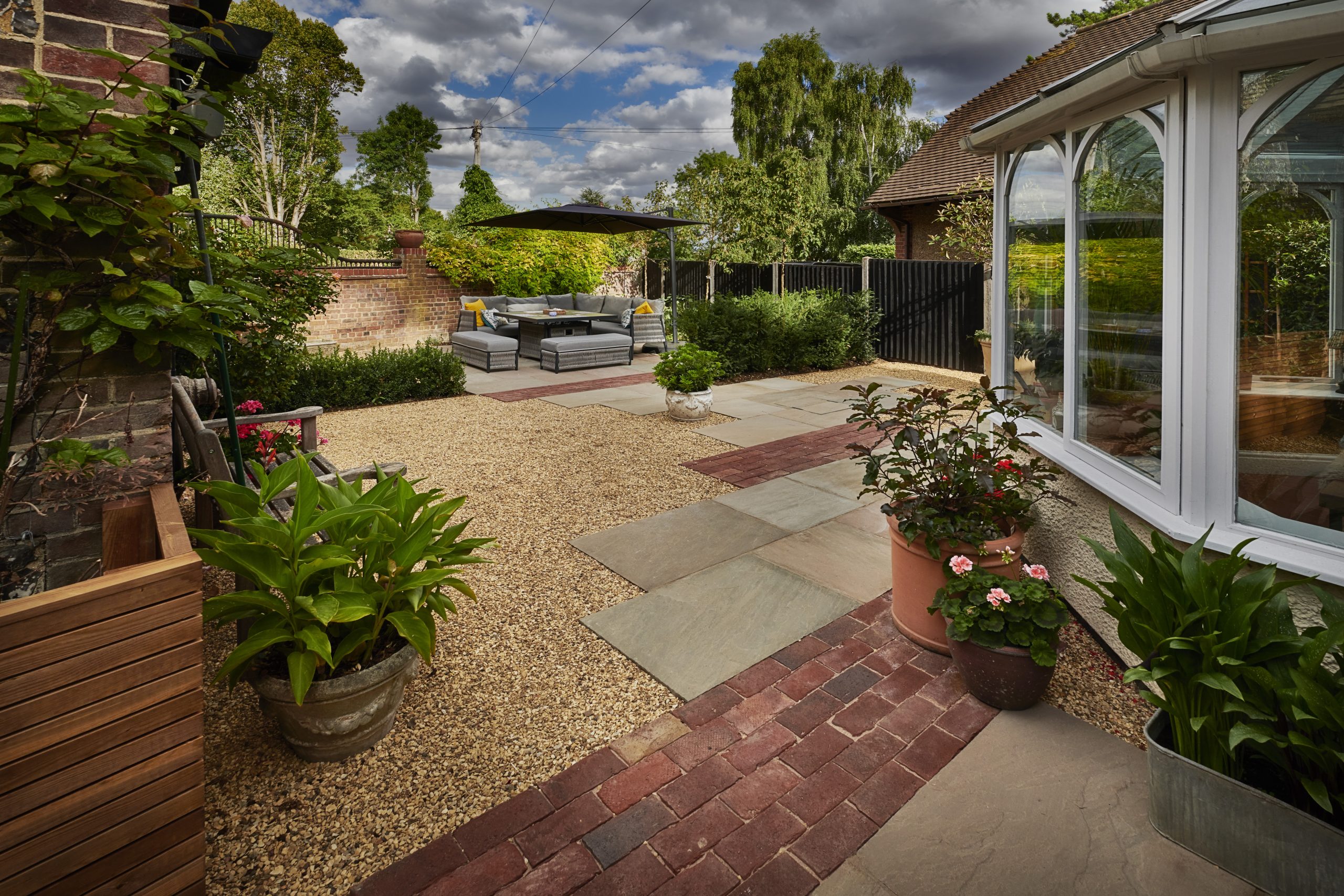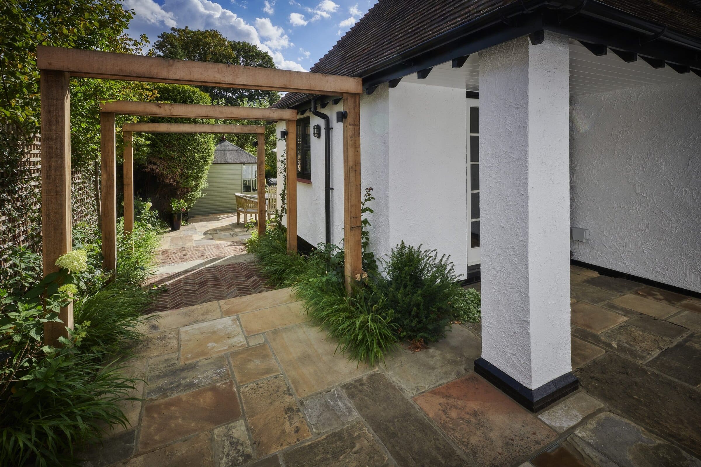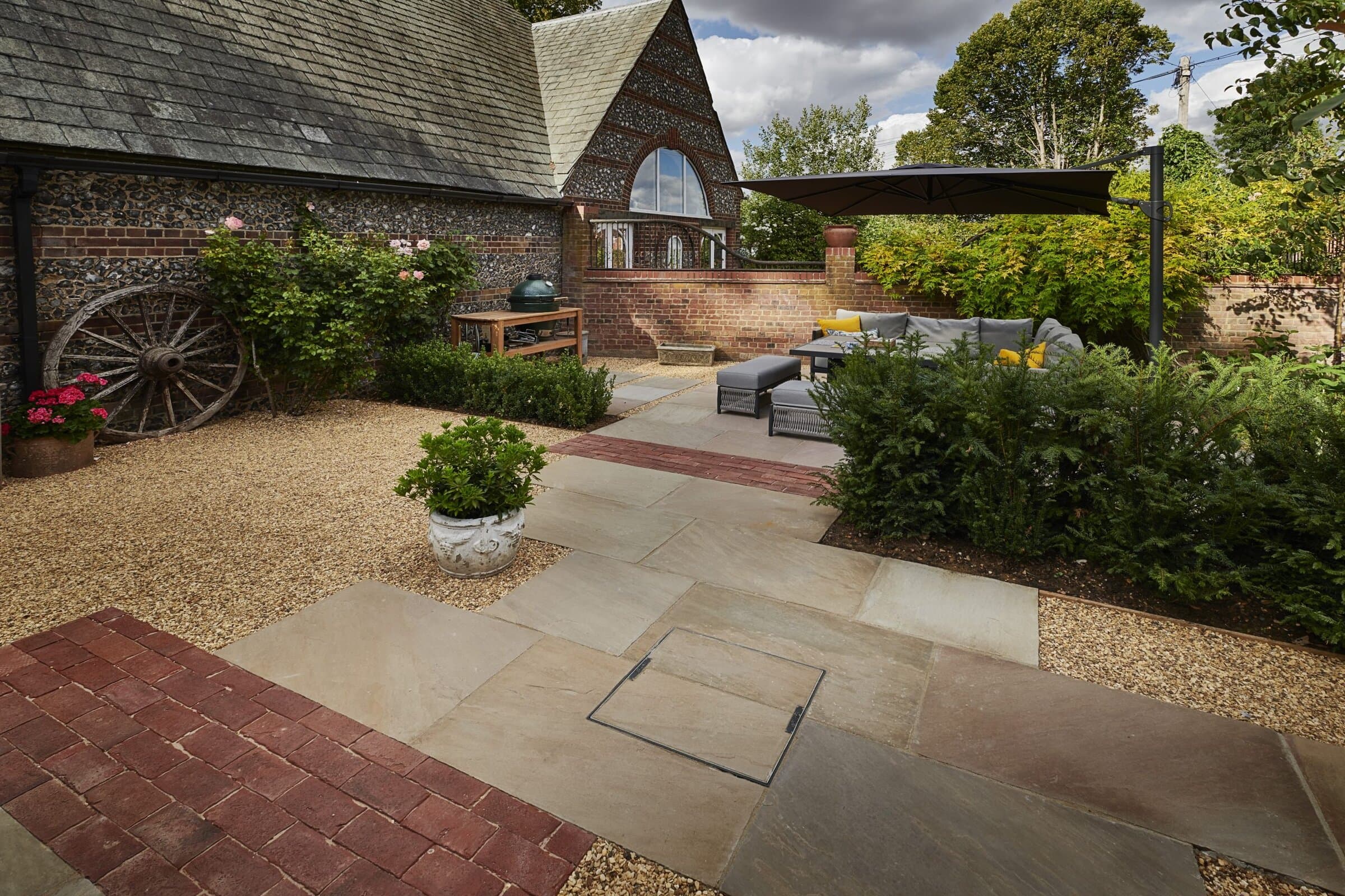One of the standout features of this project is the incorporation of reclaimed Yorkstone.  Know for its durability and character, this stone adds an air of timelessness to the garden, while its beautiful patina lends it an inviting warmth.  Complementing this beautifully are the brick herringbone linking pathways, an element that adds both functionally and aesthetic appeal, guiding one through the lush greenway and towards the properties entrance.