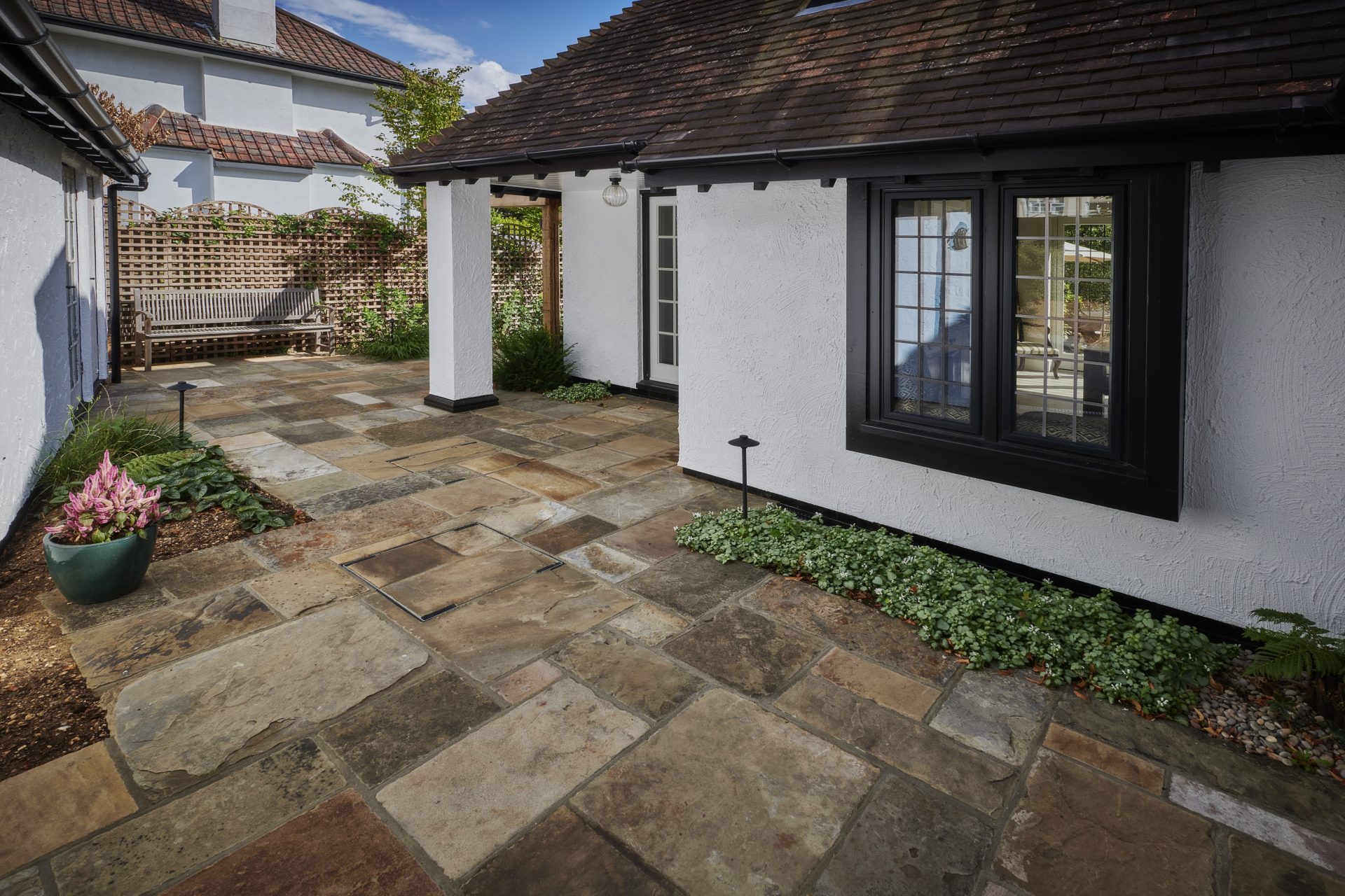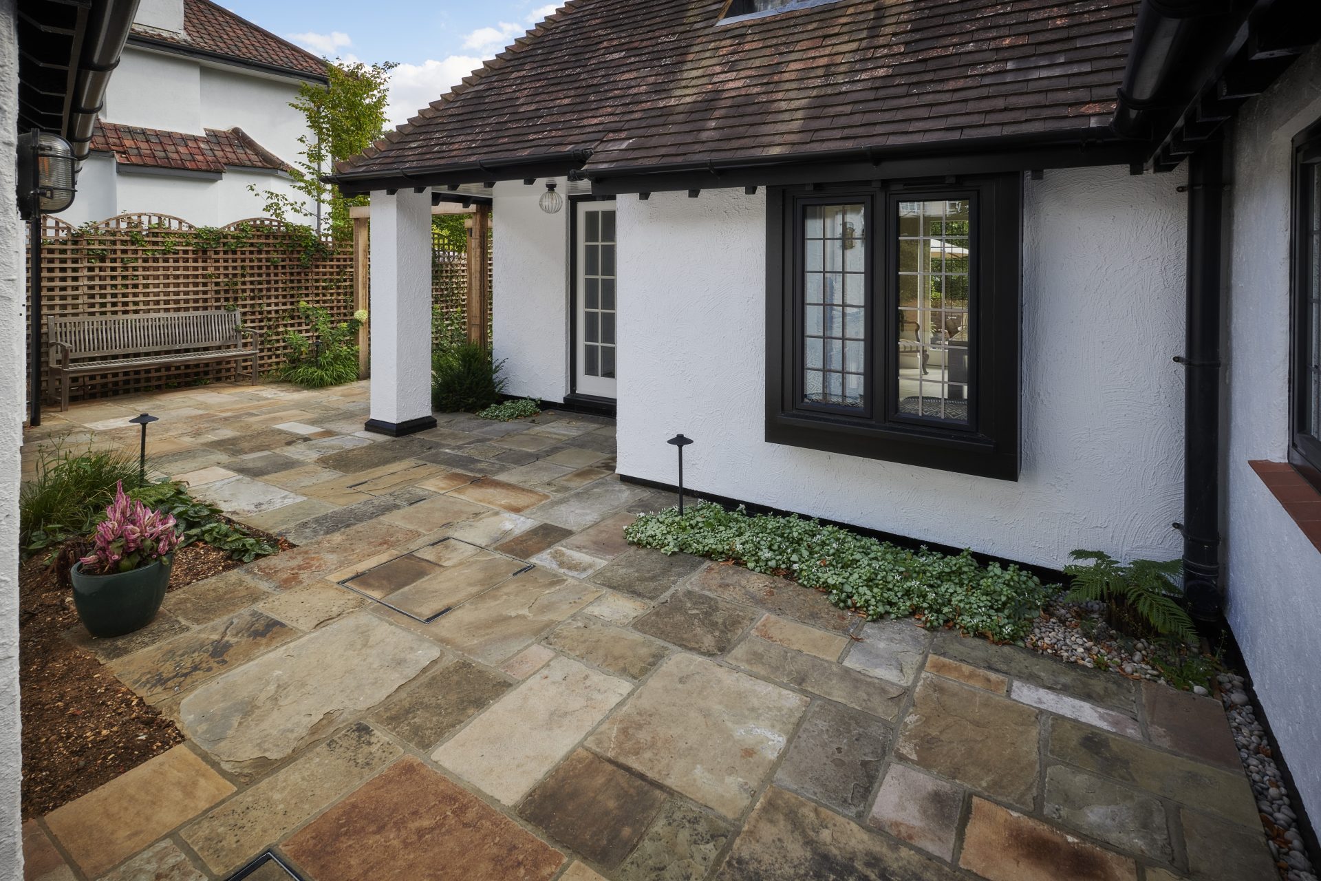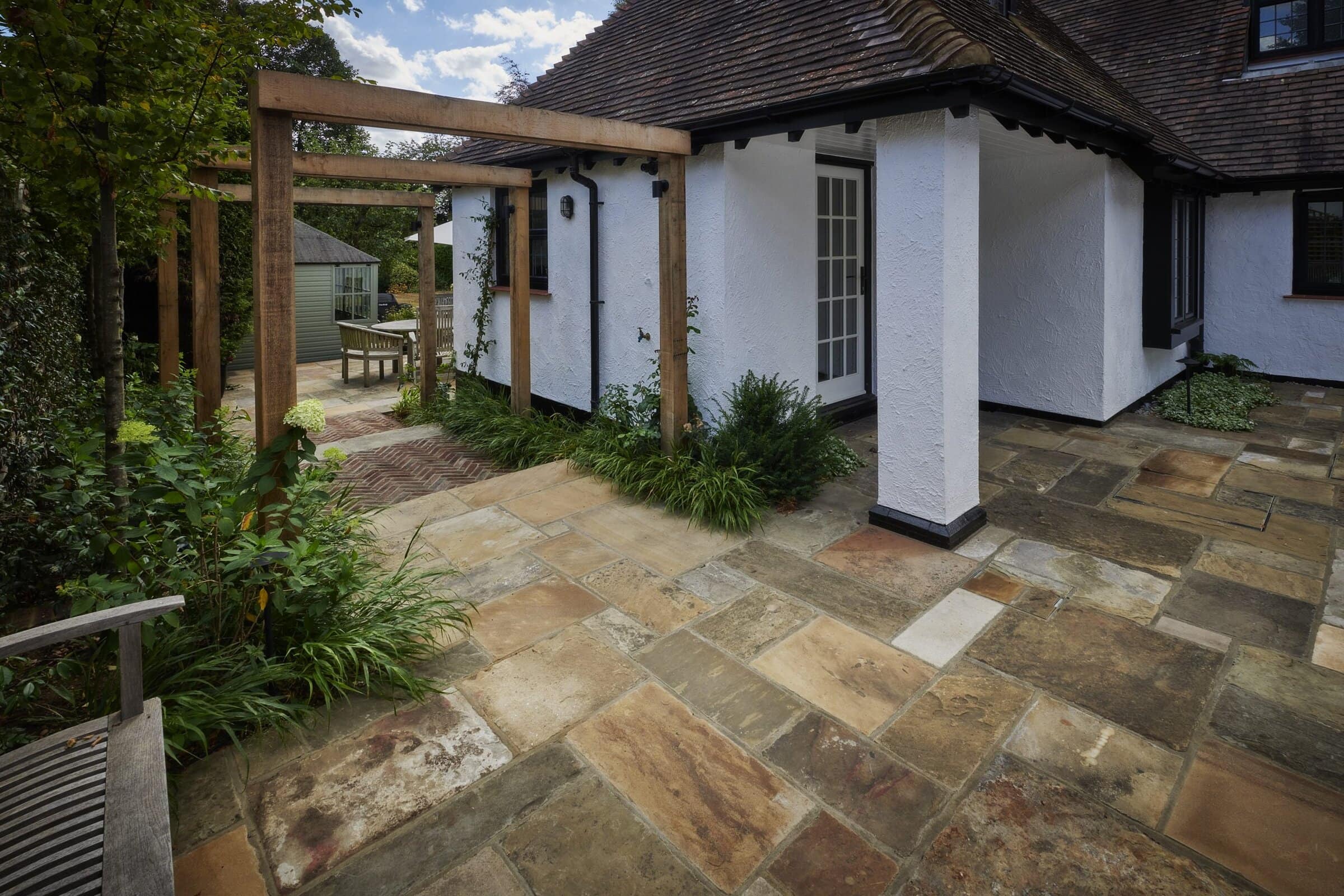 One of the standout features of this project is the incorporation of reclaimed Yorkstone.  Know for its durability and character, this stone adds an air of timelessness to the garden, while its beautiful patina lends it an inviting warmth.  Complementing this beautifully are the brick herringbone linking pathways, an element that adds both functionally and aesthetic appeal, guiding one through the lush greenway and towards the properties entrance.